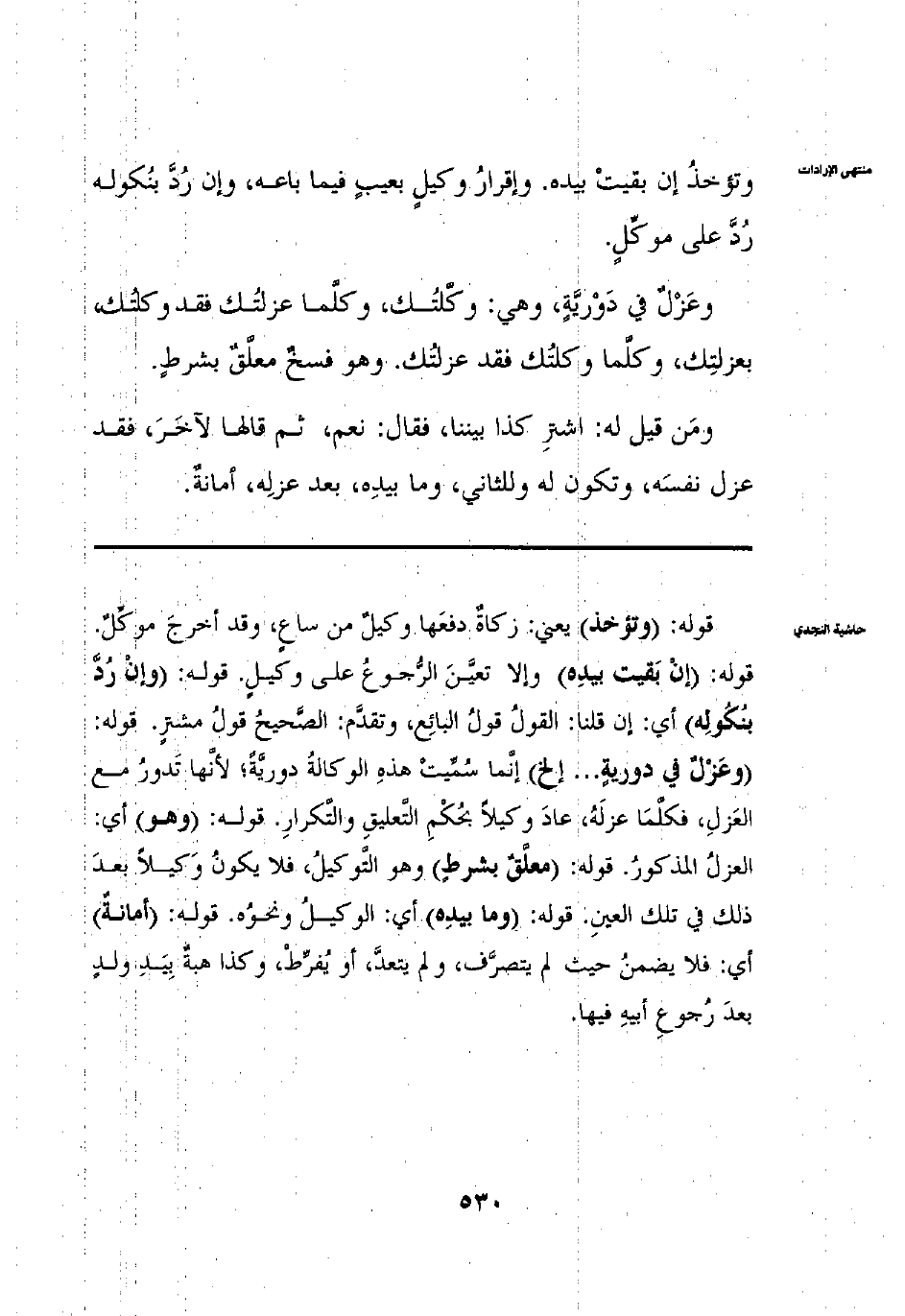 وَتُؤْخَذُ إنْ بَقِيَتْ بِيَدِهِ وإقْرَارُ وَكِيلٍ بِعَيْبٍ فِيمَا بَاعَهُ وَإِنْ رُدَّ بِنُكُولِهِ رُدَّ عَلَى مُوَكِّلٍ وَعُزِلَ فِي دَوْرِيَّةٍ وَهِيَ وَكَّلْتُكَ وَكُلَّمَا عَزَلْتُكَ فَقَدْ وَكَّلْتُكَ بعَزَلْتُكَ وَكُلَّمَا وَكَّلْتُكَ فَقَدْ عَزَلْتُكَ وَهُوَ فَسْخٌ مُعَلَّقٌ بِشَرْطٍ وَمَنْ قِيلَ لَهُ اشْتَرِ كَذَا بَيْنَنَا فَقَالَ نَعَمْ ثُمَّ قَالَهَا لِآخَرَ فَقَدْ عَزَلَ نَفْسَهُ وَتَكُونُ لَهُ وَلِلثَّانِي وَمَا بِيَدِهِ بَعْدَ عَزْلِهِ أَمَانَةٌ
