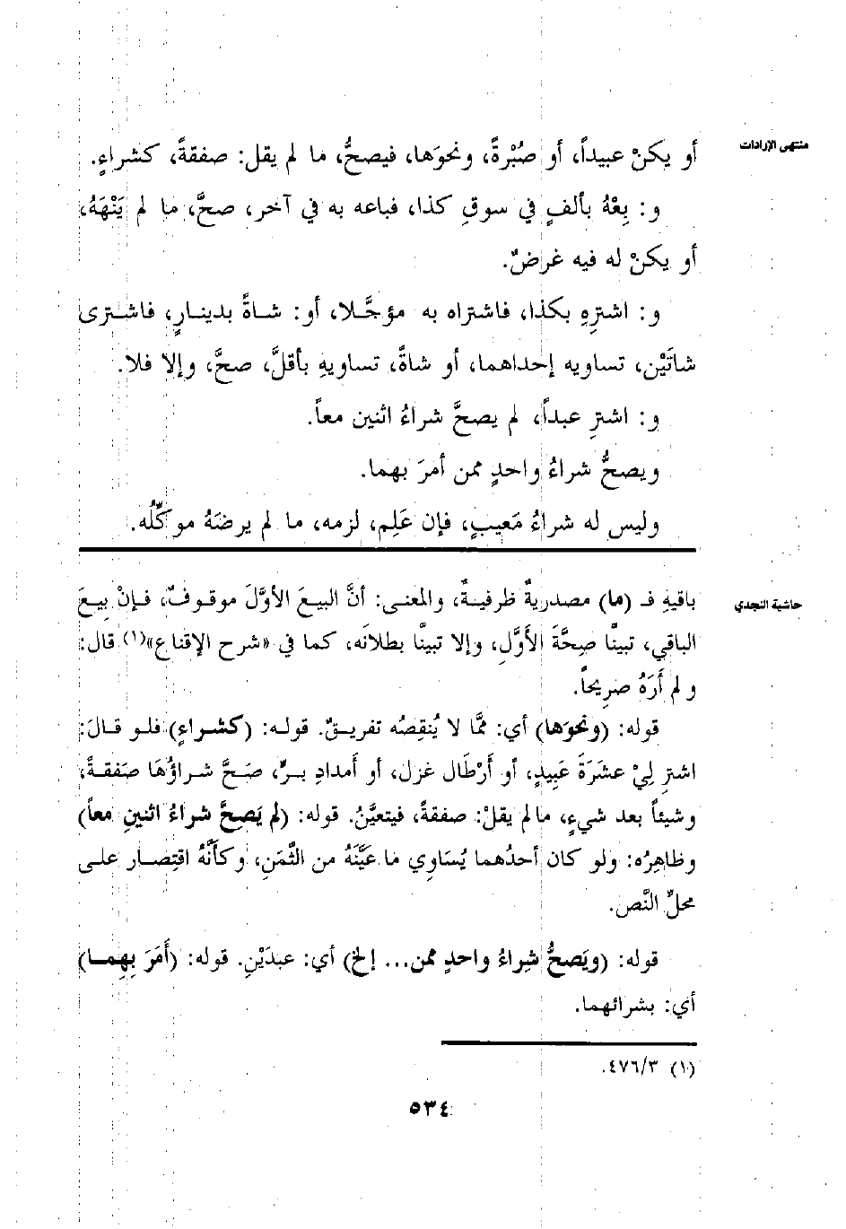 أَوْ يَكُنْ عَبِيدًا أَوْ صُبْرَةً وَنَحْوهَا فَيَصِحُّ مَا لَمْ يَقُلْ صَفْقَةً كَشِرَاءٍ وبِعْهُ بِأَلْفٍ فِي سُوقِ كَذَا فَبَاعَهُ بِهِ فِي آخَرُ صَحَّ مَا لَمْ يَنْهَهُ أَوْ يَكُنْ لَهُ فِيهِ غَرَضٌ صَحِيحٌ واشْتَرِهِ بِكَذَا فَاشْتَرَاهُ بِهِ مُؤَجَّلًا أَوْ شَاةً بِدِينَارٍ فَاشْتَرَى بِهِ شَاتَيْنِ تُسَاوِيهِ إحْدَاهُمَا أَوْ شَاةً تُسَاوِيهِ بِأَقَلَّ صَحَّ وَإِلَّا فَلَا واشْتَرِ عَبْدًا لَمْ يَصِحَّ شِرَاءُ اثْنَيْنِ مَعًا وَيَصِحُّ شِرَاءُ وَاحِدٍ مِمَّنْ أُمِرَ بِشِرَائِهِمَا وَلَيْسَ لَهُ شِرَاءُ مَعِيبٍ لَزِمَهُ مَا لَمْ يَرْضَهُ مُوَكِّلُهُ