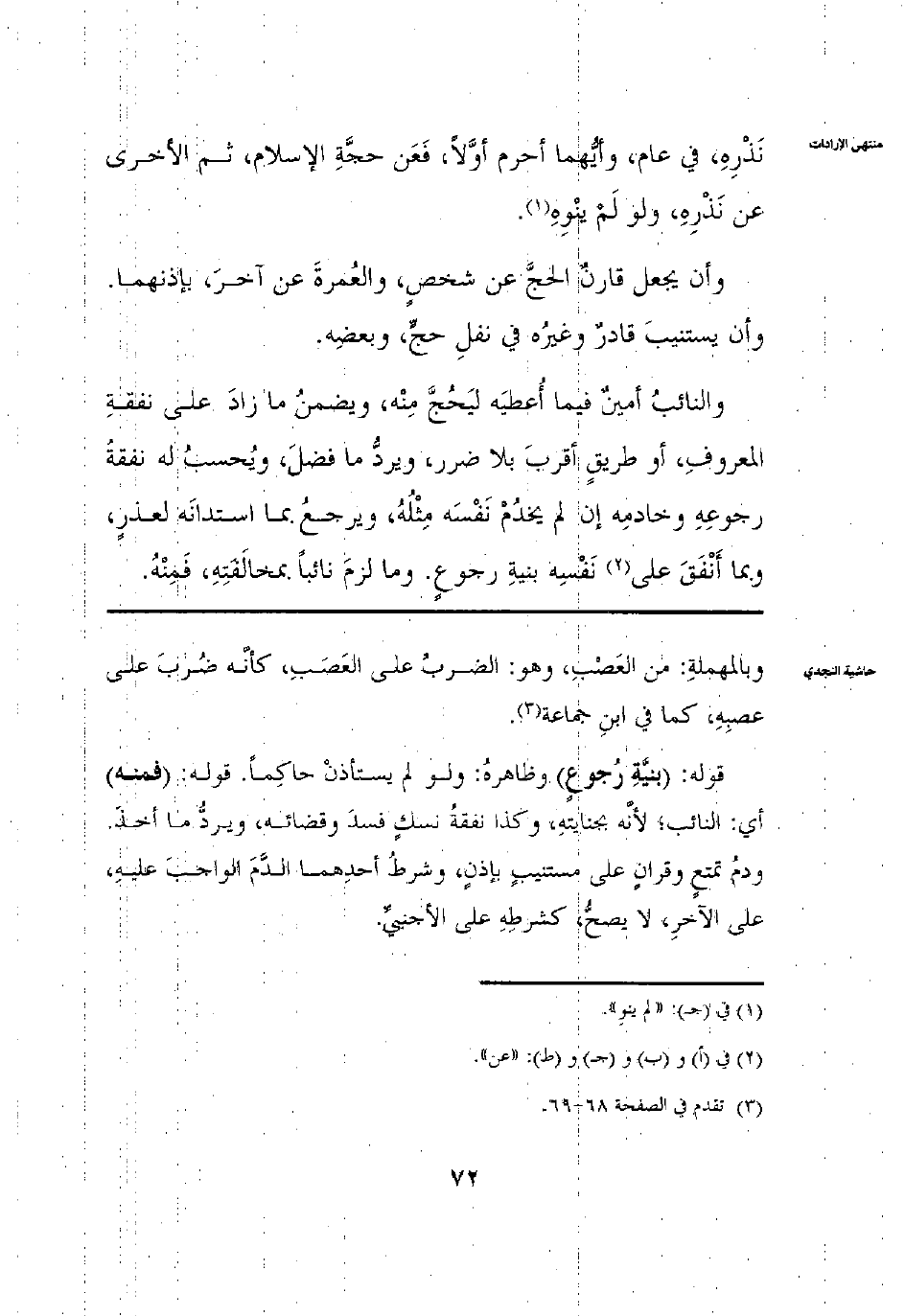 نَذْرِهِ فِي عَامٍ وَأَيُّهُمَا أَحْرَمَ أَوَّلًا فَعَنْ حِجَّةِ الْإِسْلَامِ، ثُمَّ الْأُخْرَى عَنْ نَذْرِهِ وَلَوْ لَمْ يَنْوِهِ وأَنْ يَجْعَلَ قَارِنٌ الْحَجَّ عَنْ شَخْصٍ والْعُمْرَةَ عَنْ آخَرَ بِإِذْنِهِمَا وأَنْ يَسْتَنِيبَ قَادِرٌ وَغَيْرُهُ فِي نَفْلِ حَجٍّ، وفَرْضِهِ وَالنَّائِبُ أَمِينٌ فِيمَا أُعْطِيهِ لِيَحُجَّ مِنْهُ وَيَضْمَنُ مَا زَادَ عَلَى نَفَقَةِ الْمَعْرُوفِ أَوْ طَرِيقٍ أَقْرَبَ بِلَا ضَرَرٍ وأَنْ يَرُدَّ مَا فَضَلَ ولَهُ نَفَقَةُ رُجُوعِهِ وخَادِمِهِ إنْ لَمْ يَخْدِمْ نَفْسَهُ مِثْلُهُ وَيَرْجِعُ بِمَا اسْتَدَانَهُ لِعُذْرٍ وبِمَا أَنْفَقَ عَلَى نَفْسِهِ بِنِيَّةِ رُجُوعٍ وَمَا لَزِمَ نَائِبًا بِمُخَالَفَتِهِ فمنه