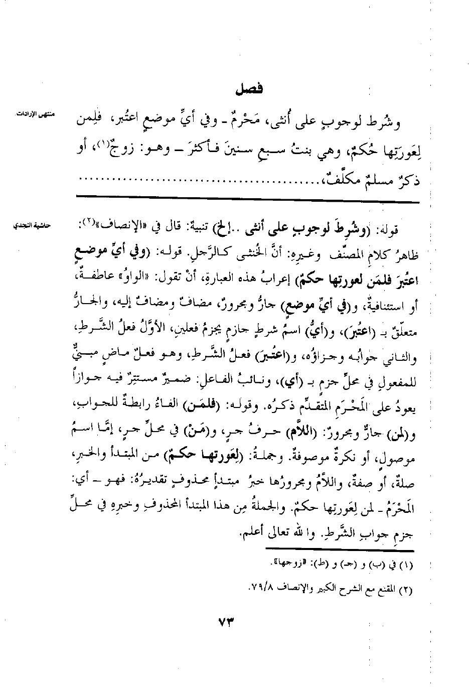 وشرط لوجوب عَلَى أُنْثَى: مَحْرَمٌ أَيِّ مَوْضِعٍ اُعْتُبِرَ فَلِمَنْ لِعَوْرَتِهَا حُكْمٌ، وَهِيَ بِنْتُ سَبْعِ سِنِينَ فَأَكْثَرَ وَهُوَ زَوْجٌ أَوْ ذَكَرٌ مُسْلِمٌ مُكَلَّفٌ