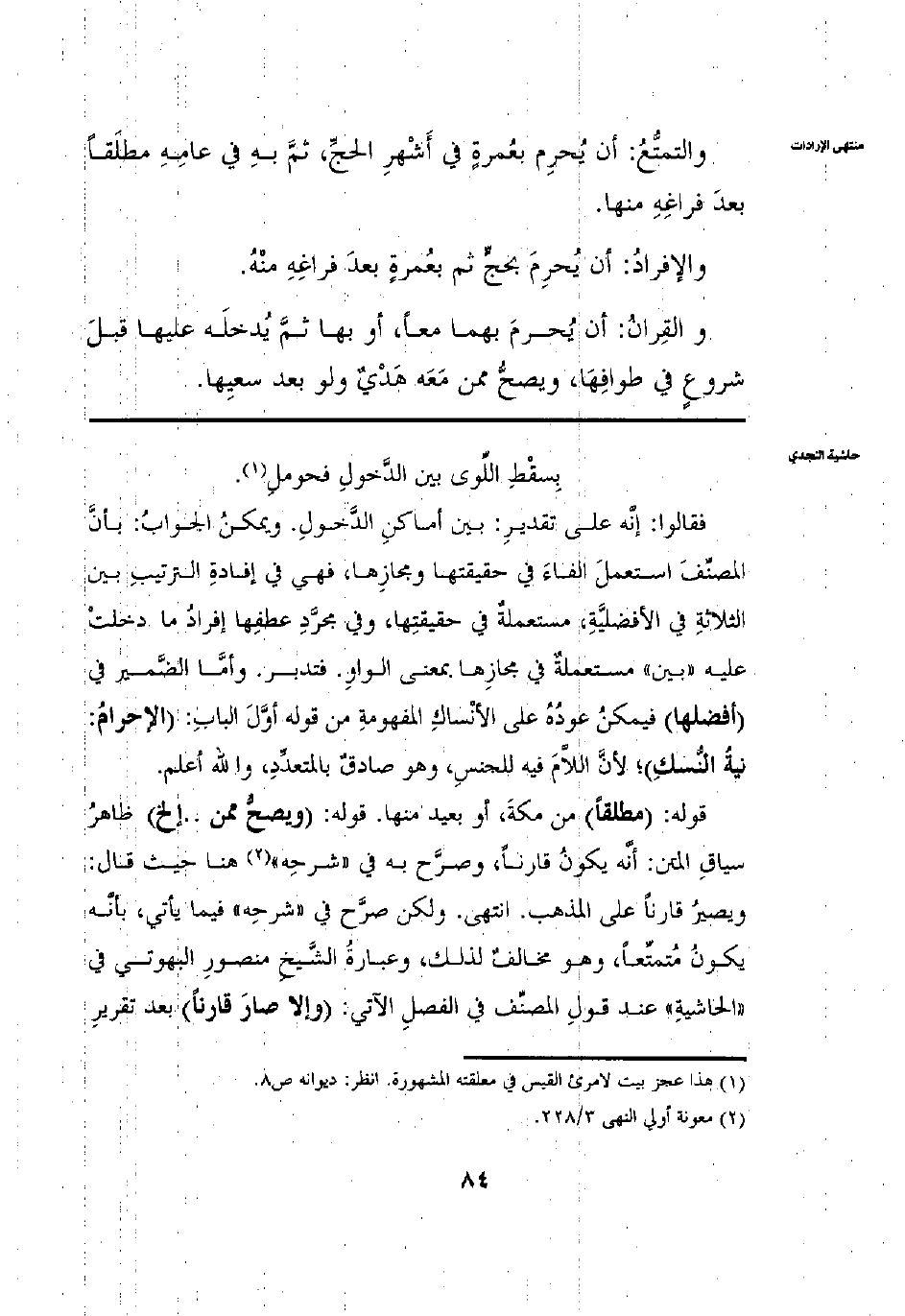والتَّمَتُّعِ: أَنْ يُحْرِمَ بِعُمْرَةٍ فِي أَشْهُرِ الْحَجِّ وبِهِ فِي عَامِهِ مُطْلَقًا بَعْدَ فَرَاغِهِ مِنْهَا والْإِفْرَادِ: أَنْ يُحْرِمَ ابْتِدَاءً بِحَجٍّ ثُمَّ يُحْرِمَ بِعُمْرَةٍ بَعْدَ فَرَاغِهِ مِنْهُ والْقِرَانِ: أَنْ يُحْرِمَ بِهِمَا أَيْ الْحَجِّ وَالْعُمْرَةِ مَعًا أَوْ يُحْرِمَ بِهَا ثُمَّ يُدْخِلُهُ عَلَيْهَا قَبْلَ شُرُوعِهِ فِي طَوَافِهَا وَيَصِحُّ مِمَّنْ مَعَهُ هَدْيٌ وَلَوْ بَعْدَ سَعْيِهَا