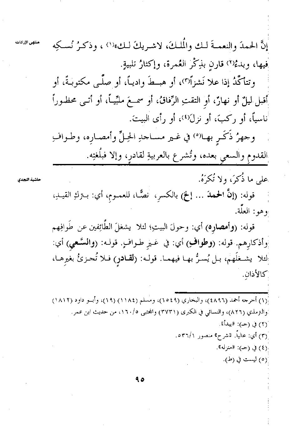 إنَّ الْحَمْدَ وَالنِّعْمَةَ لَكَ وَالْمُلْكَ لَا شَرِيكَ لَكَ وَسُنَّ ذِكْرُ نُسُكِهِ فِيهَا وَسُنَّ بَدْءُ قَارِنٍ بِذِكْرِ الْعُمْرَةِ وَسُنَّ إكْثَارُ تَلْبِيَةٍ وَتَتَأَكَّدُ التَّلْبِيَةُ إذَا عَلَا نَشَزًا أَوْ هَبَطَ وَادِيًا، أَوْ صَلَّى مَكْتُوبَةً، أَوْ أَقْبَلَ لَيْلٌ، أَوْ أَقْبَلَ نَهَارٌ، أَوْ الْتَقَتْ الرِّفَاقُ، أَوْ سَمِعَ مُلَبِّيًا، أَوْ أَتَى مَحْظُورًا نَاسِيًا، أَوْ رَكِبَ دَابَّتَهُ، أَوْ نَزَلَ عَنْهَا، أَوْ رَأَى الْبَيْتَ وَسُنَّ جَهْرُ ذِكْرٍ بِهَا فِي غَيْرِ مَسَاجِدِ الْحِلِّ وَأَمْصَارِهِ وطَوَافِ الْقُدُومِ وَالسَّعْيِ بَعْدَهُ وَتُشْرَعُ بِالْعَرَبِيَّةِ لِقَادِرٍ وَأَلَّا فبِلُغَتِهِ