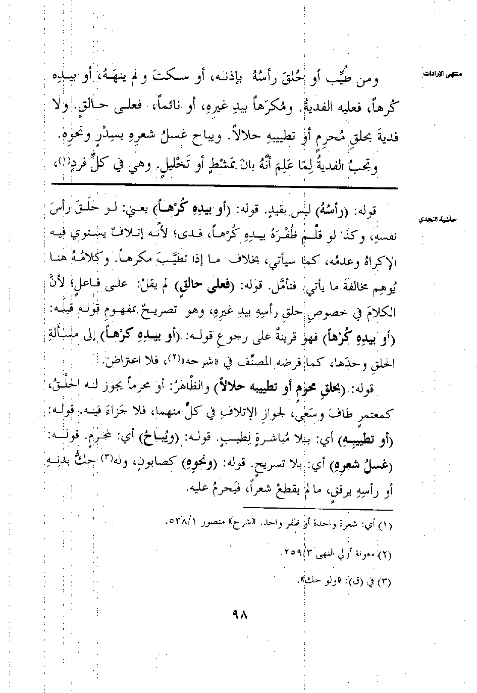 وَمَنْ طُيِّبَ أَوْ حُلِقَ رَأْسُهُ بِإِذْنِهِ أَوْ سَكَتَ وَلَمْ يَنْهَهُ أَوْ حَلَقَ رَأْسَ نَفْسِهِ أَوْ قَلَّمَ ظُفْرَهُ كُرْهًا فَعَلَيْهِ الْفِدْيَةُ وَإِنْ حُلِقَ رَأْسُهُ مُكْرَهًا بِيَدِ غَيْرِهِ أَوْ نَائِمًا فَالْفِدْيَةُ وَلَا فِدْيَةَ بِحَلْقِ مُحْرِمٍ أَوْ تَطَيُّبِهِ حَلَالًا وَيُبَاحُ غَسْلُ شَعْرِهِ بِسِدْرٍ وَنَحْوِهِ وَتَجِبُ الْفِدْيَةُ لِمَا عُلِمَ أَنَّهُ بَانَ بِمُشْطٍ أَوْ تَخْلِيلٍ وَهِيَ فِي كُلِّ فَرْدٍ