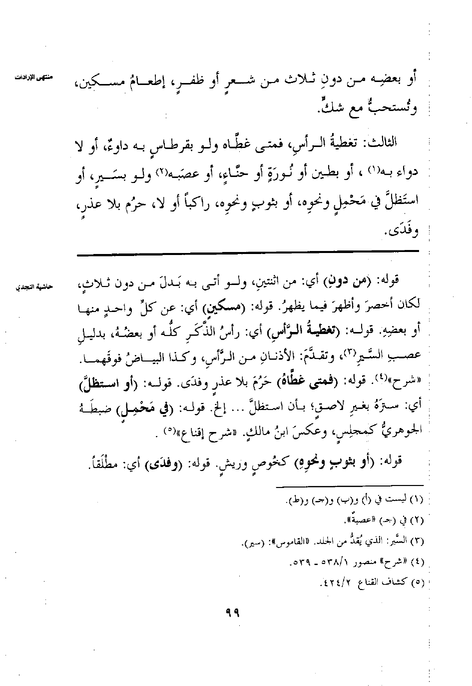 الثَّالِثُ: تَغْطِيَةُ الرَّأْسِ فَمَتَى غَطَّاهُ وَلَوْ بِقِرْطَاسٍ بِهِ دَوَاءٌ أَوْ لَا دَوَاءَ بِهِ، أَوْ غَطَّاهُ بِطِينٍ أَوْ نُورَةٍ أَوْ حِنَّاءٍ، أَوْ عَصَبَهُ وَلَوْ يَسِيرًا أَوْ اسْتَظَلَّ فِي مَحْمَلٍ وَنَحْوَهُ بِثَوْبٍ وَنَحْوِهِ رَاكِبًا أَوْ لَا حَرُمَ بِلَا عُذْرٍ وَفَدَى