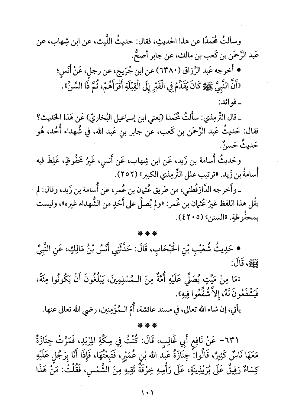 - وأخرجه الدارقُطني، من طريق عثمان بن عمر، عن أُسامة بن زيد، وقال: لم يقل هذا اللفظ غير عثمان بن عمر: «ولم يصل على أحد من الشهداء غيره»، وليست بمحفوظة. «السنن» (٤٢٠٥).