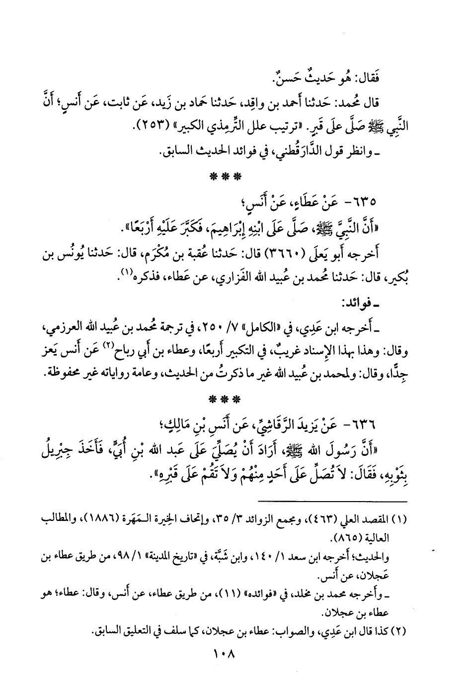 - وقال ابن حَجر: روى ابن سعد، وأَبو يَعلى، من طريق عطاء بن عَجلان، وهو ضعيف، عن أَنس؛ أَن النبي صَلى الله عَليه وسَلم صلى على ابنه إبراهيم، وكَبَّر عليه أَربعًا. «الإصابة» ١/ ٣٣٩.