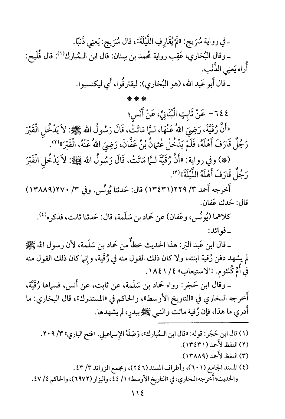 - وقال ابن عبد البَرِّ: هذا الحديث خطأٌ من حماد بن سلمة، لأَن رسول الله صَلى الله عَليه وسَلم لم يشهد دفن رُقَية ابنته، ولا كان ذلك القول منه في رُقَية، وإِنما كان ذلك القول منه في أُم كُلثوم. «الاستيعاب» ٤/ ١٨٤١.