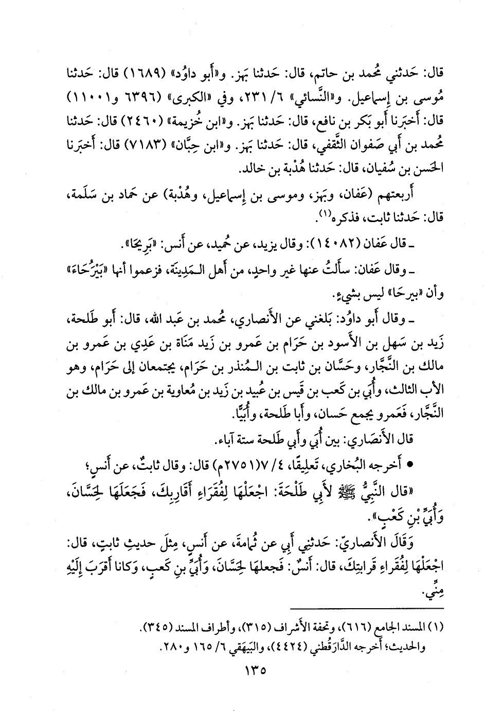 - وقال أَبو داود: بلغني عن الأَنصاري، محمد بن عبد الله، قال: أَبو طلحة، زيد بن سهل بن الأسود بن حرام بن عَمرو بن زيد مناة بن عَدي بن عَمرو بن مالك بن النجار، وحسان بن ثابت بن المنذر بن حرام، يجتمعان إلى حرام، وهو الأب الثالث، وأُبي بن كعب بن قيس بن عبيد بن زيد بن معاوية بن عَمرو بن مالك بن النجار، فعَمرو يجمع حسان، وأبا طلحة، وأبيا.