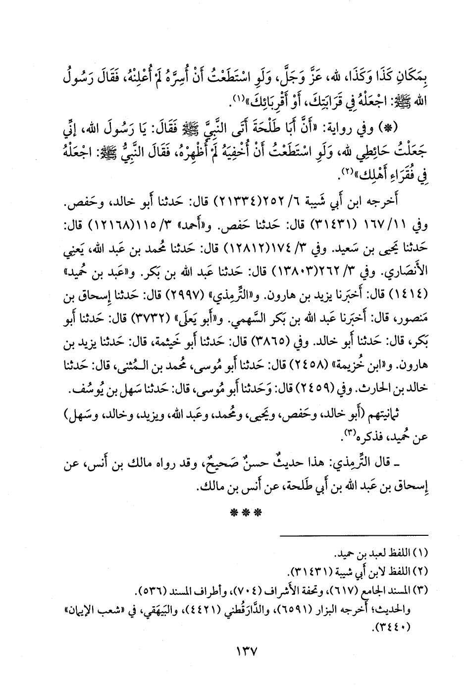 وفي ٣/ ٢٦٢ (١٣٨٠٣) قال: حدثنا عبد الله بن بكر. و «عَبد بن حُميد» (١٤١٤) قال: أخبرنا يزيد بن هارون. و «التِّرمِذي» (٢٩٩٧) قال: حدثنا إسحاق بن منصور، قال: أخبرنا عبد الله بن بكر السهمي. و «أَبو يَعلى» (٣٧٣٢) قال: حدثنا أَبو بكر، قال: حدثنا أَبو خالد. وفي (٣٨٦٥) قال: حدثنا أَبو خيثمة، قال: حدثنا يزيد بن هارون. و «ابن خزيمة» (٢٤٥٨) قال: حدثنا أَبو موسى، محمد بن المثنى، قال: حدثنا خالد بن الحارث. وفي (٢٤٥٩) قال: وحدثنا أَبو موسى، قال: حدثنا سهل بن يوسف.