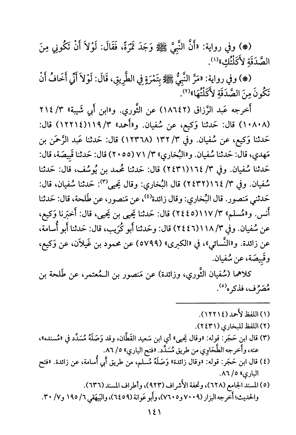 وفي ٣/ ١٣٢ (١٢٣٦٨) قال: حدثنا عبد الرَّحمَن بن مهدي، قال: حدثنا سفيان. و «البخاري» ٣/ ٥٤ (٢٠٥٥) قال: حدثنا قَبيصَة، قال: حدثنا سفيان. وفي ٣/ ١٢٥ (٢٤٣١) قال: حدثنا محمد بن يوسف، قال: حدثنا سفيان. وفي ٣/ ١٢٥ (٢٤٣٢) قال البخاري: وقال يحيى (¬١): حدثنا سفيان، قال: حدثني منصور. قال البخاري: وقال زائدة (¬٢)، عن منصور، عن طلحة، قال: حدثنا أنس. و «مسلم» ٣/ ١١٧ (٢٤٤٥) قال: حدثنا يحيى بن يحيى، قال: أخبرنا وكيع، عن سفيان. وفي ٣/ ١١٨ (٢٤٤٦) قال: وحدثنا أَبو كُريب، قال: حدثنا أَبو أُسامة، عن زائدة. و «النَّسَائي» في «الكبرى» (٥٧٩٩) عن محمود بن غَيلان، عن وكيع، وقَبيصَة، عن سفيان.
