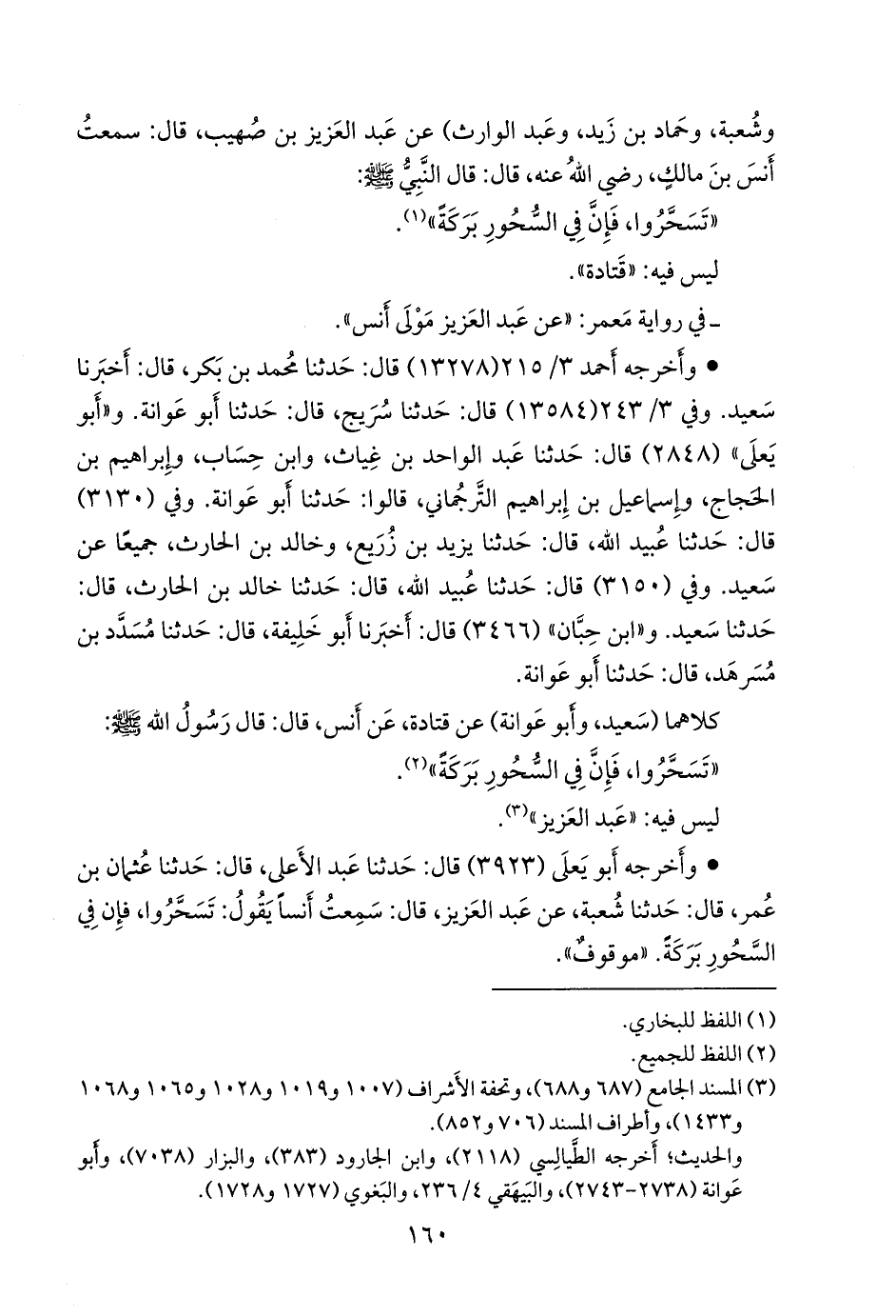 - وأخرجه أَبو يَعلى (٣٩٢٣) قال: حدثنا عبد الأعلى، قال: حدثنا عثمان بن عمر، قال: حدثنا شعبة، عن عبد العزيز، قال: سمعت أَنسًا يقول: تسحروا، فإن في السحور بركة. «موقوف».