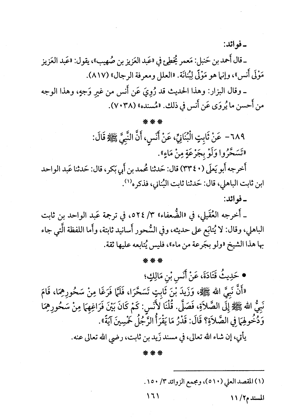 - وقال الذهبي: عبد الواحد بن ثابت الباهلي، عن ثابت البُنَاني، عن أَنس؛ تسحروا ولو بجَرعة، ينفرد به، قال العُقيلي: لا يُتابَع عليه، رواه عنه إبراهيم بن الحجاج، وقال البخاري: منكر الحديث. «ميزان الاعتدال» ٢/ ٦٧١.