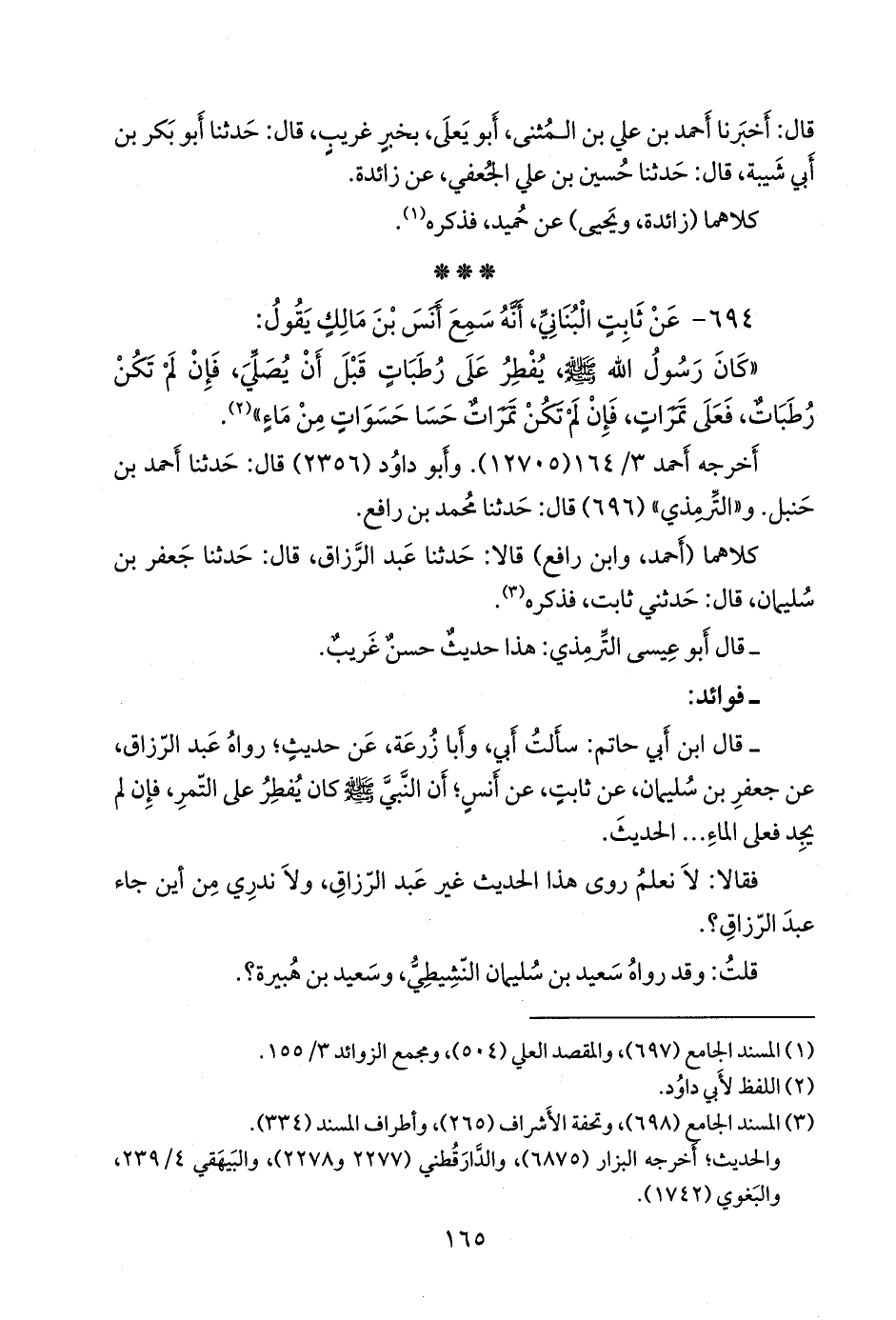 - وقال ابن أَبي حاتم: سأَلتُ أَبي، وأَبا زُرعَة، عن حديث؛ رواه عبد الرزاق، عن جعفر بن سليمان، عن ثابت، عن أَنس؛ أَن النبي صَلى الله عَليه وسَلم كان يفطر على التمر، فإِن لم يجد فعلى الماء، الحديث.