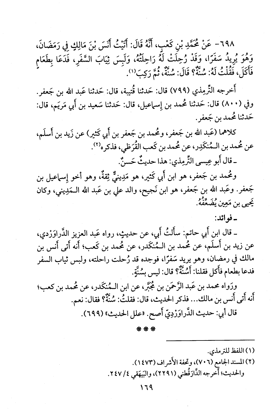 ٦٩٨ - عن محمد بن كعب، أنه قال: أتيت أَنس بن مالك في رمضان، وهو يريد سفرا، وقد رحلت له راحلته، ولبس ثياب السفر، فدعا بطعام فأكل، فقلت له: سنة؟ قال: سنة، ثم ركب (¬١).