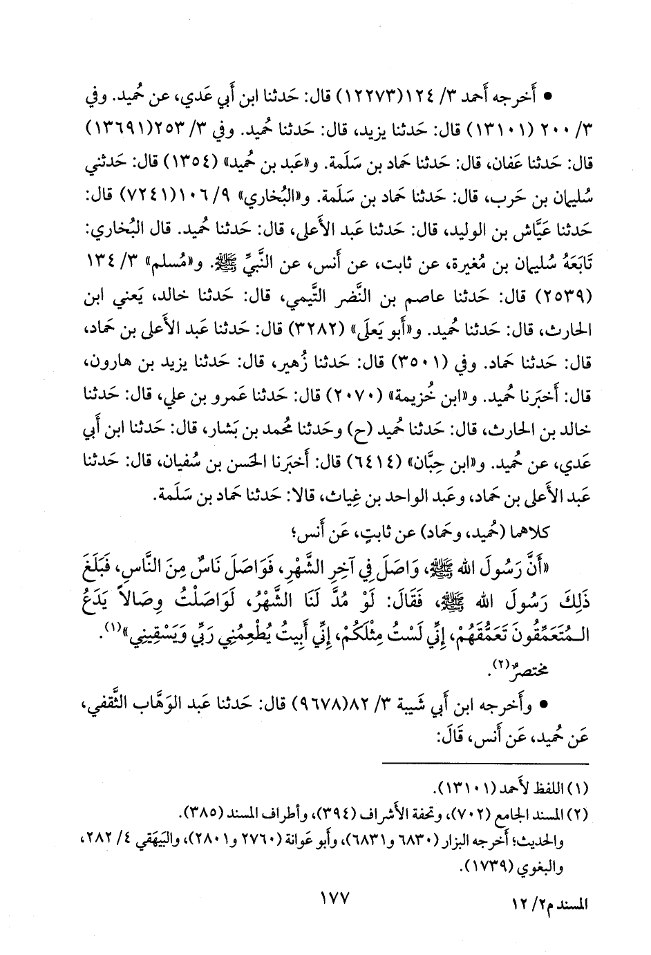 قال البخاري: تابعه سليمان بن مغيرة، عن ثابت، عن أَنس، عن النبي صَلى الله عَليه وسَلم. و «مسلم» ٣/ ١٣٤ (٢٥٣٩) قال: حدثنا عاصم بن النضر التيمي، قال: حدثنا خالد، يعني ابن الحارث، قال: حدثنا حميد. و «أَبو يَعلى» (٣٢٨٢) قال: حدثنا عبد الأعلى بن حماد، قال: حدثنا حماد. وفي (٣٥٠١) قال: حدثنا زهير، قال: حدثنا يزيد بن هارون، قال: أخبرنا حميد. و «ابن خزيمة» (٢٠٧٠) قال: حدثنا عَمرو بن علي، قال: حدثنا خالد بن الحارث، قال: حدثنا حميد (ح) وحدثنا محمد بن بشار، قال: حدثنا ابن أَبي عَدي، عن حميد. و «ابن حِبَّان» (٦٤١٤) قال: أخبرنا الحسن بن سفيان، قال: حدثنا عبد الأعلى بن حماد، وعبد الواحد بن غياث، قالا: حدثنا حماد بن سلمة.