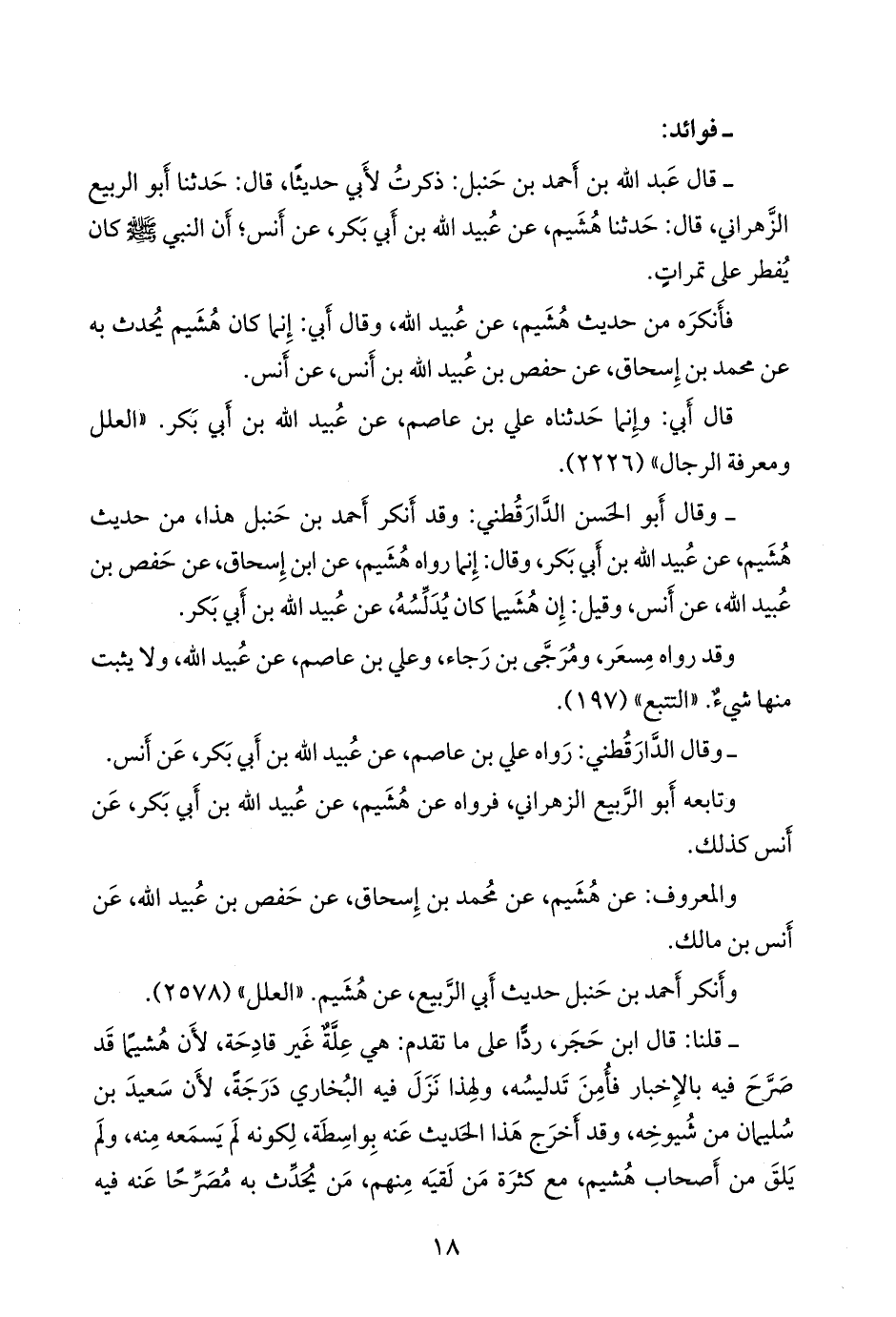 وقد أنكر أحمد بن حنبل هذا من حديث هُشيم، عن عُبيد الله بن أَبي بكر، وقال: إنما رواه هُشيم، عن ابن إسحاق، عن حفص بن عُبيد الله، عن أَنس.