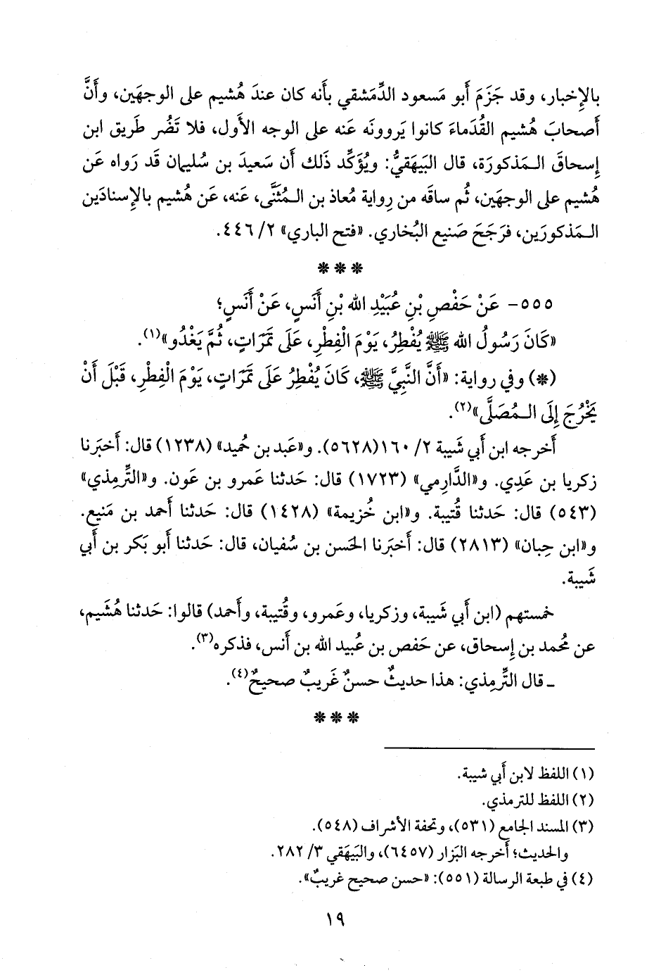 - وفي رواية: «أن النبي صَلى الله عَليه وسَلم كان يفطر على تمرات، يوم الفطر، قبل أن يخرج إلى المصلى» (¬٢).
