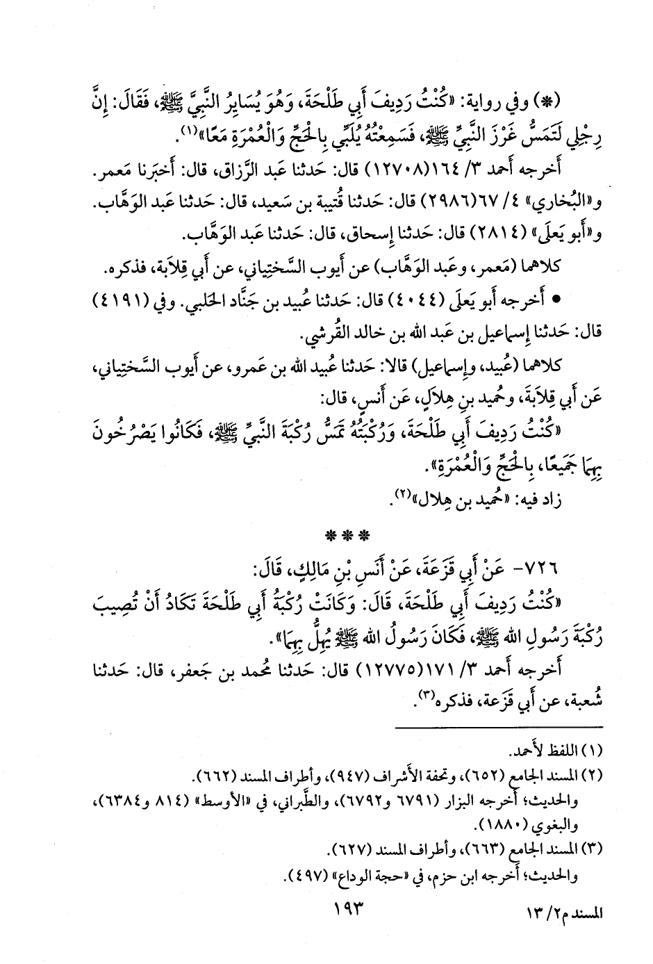 «كنت رديف أبي طلحة، قال: وكانت ركبة أبي طلحة تكاد أن تصيب ركبة رسول الله صَلى الله عَليه وسَلم فكان رسول الله صَلى الله عَليه وسَلم يهل بهما».
