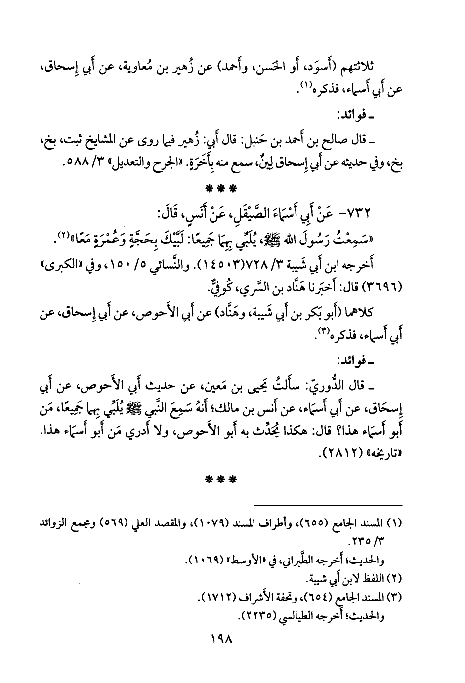 - قلنا: إِسناده ضعيفٌ؛ قال عباس بن محمد الدُّوري: سأَلتُ يَحيى، يعني ابن مَعين، عن حديث أَبي الأَحوص، عن أَبي إِسحاق، عن أَبي أَسماء، عن أَنس ابن مالك؛ أَنه سمع النبي صَلى الله عَليه وسَلم يُلَبي بهما جميعًا، مَن أَبو أَسماء هذا؟ قال: هكذا يُحَدِّث به أَبو الأَحوص، ولا أَدري مَن أَبو أَسماء هذا. (٢٨١٢).