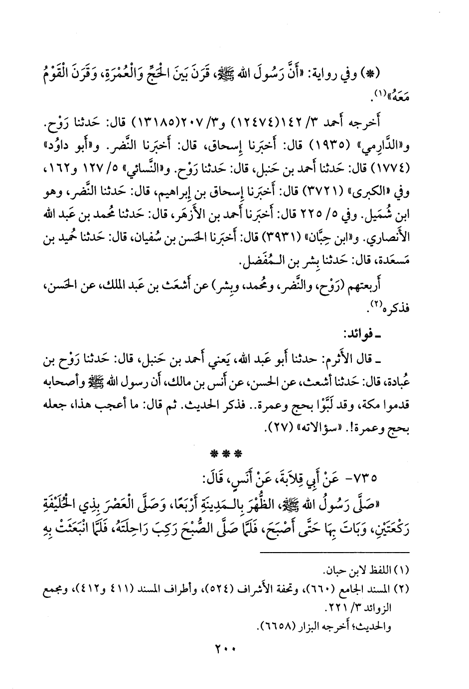 - قال الأَثرم: حدثنا أَبو عبد الله، يعني أَحمد بن حنبل، قال: حدثنا رَوح بن عُبادة، قال: حدثنا أَشعث، عن الحسن، عن أَنس بن مالك، أَن رسول الله صَلى الله عَليه وسَلم وأَصحابه قدموا مكة، وقد لبوا بحج وعمرة .. فذكر الحديث. ثم قال: ما أَعجب هذا، جعله بحج وعمرة!. «سؤالاته» (٢٧).