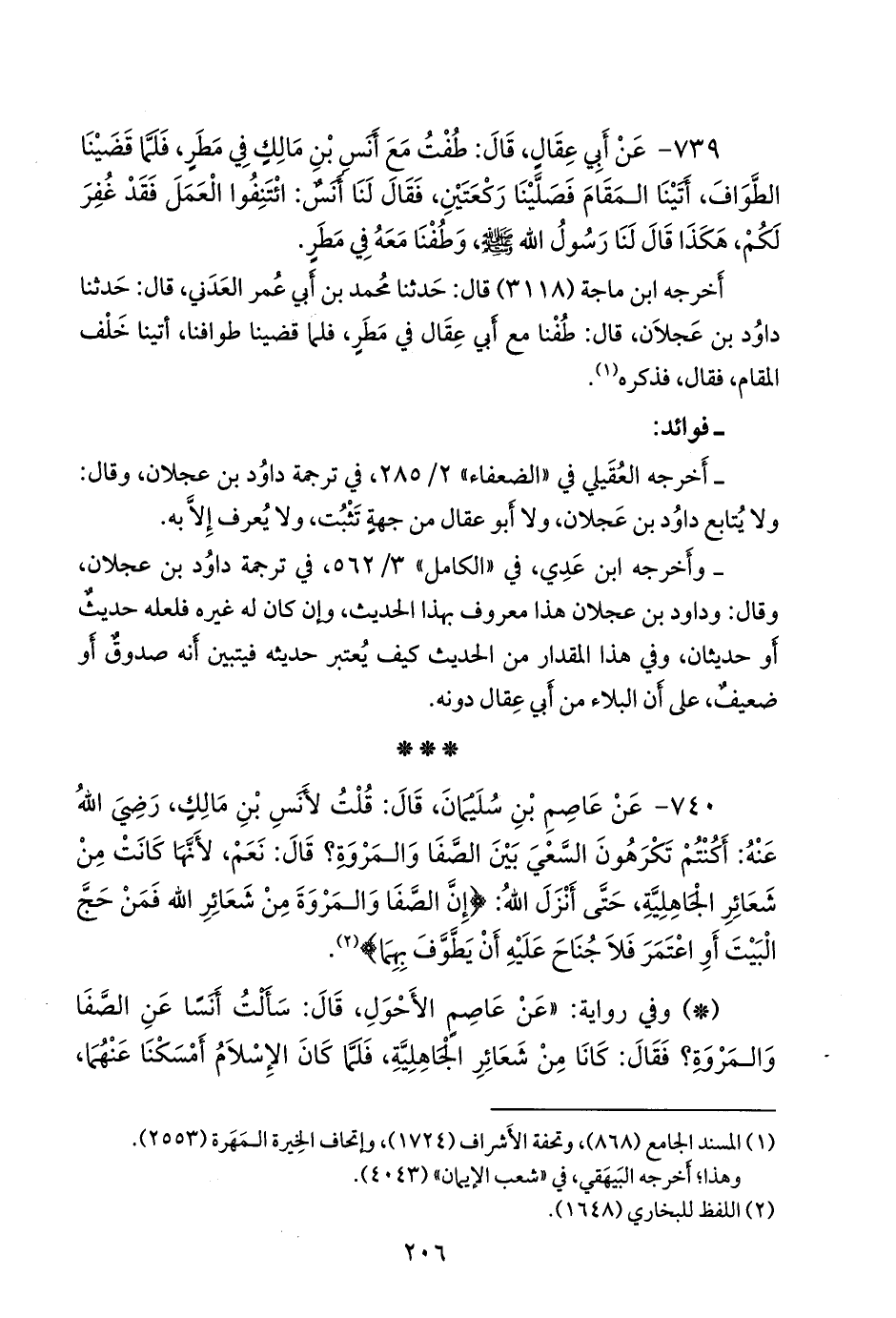 ٧٤٠ - عن عاصم بن سليمان، قال: قلت لأنس بن مالك، رضي الله عنه: أكنتم تكرهون السعي بين الصفا والمروة؟ قال: نعم، لأنها كانت من شعائر الجاهلية، حتى أنزل الله: {إن الصفا والمروة من شعائر الله فمن حج البيت أو اعتمر فلا جناح عليه أن يطوف بهما} (¬١).
