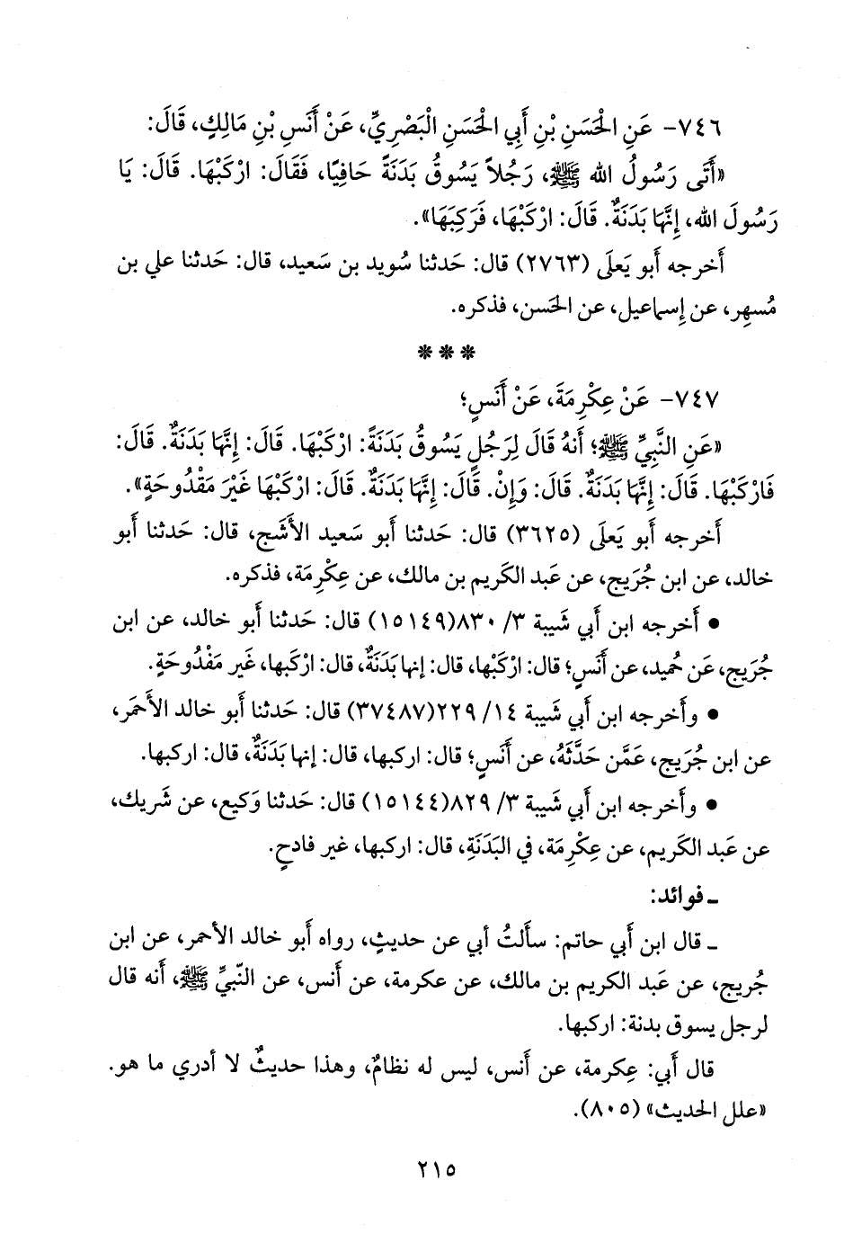 - قلنا: إِسناده ضعيفٌ؛ قال ابن أَبي حاتم: سأَلتُ أَبي عن حديث، رواه أَبو خالد الأَحمر، عن ابن جُريج، عن عبد الكريم بن مالك، عن عكرمة، عن أَنس، عن النبي صَلى الله عَليه وسَلم أَنه قال لرجل يسوق بَدَنة: اركبها.