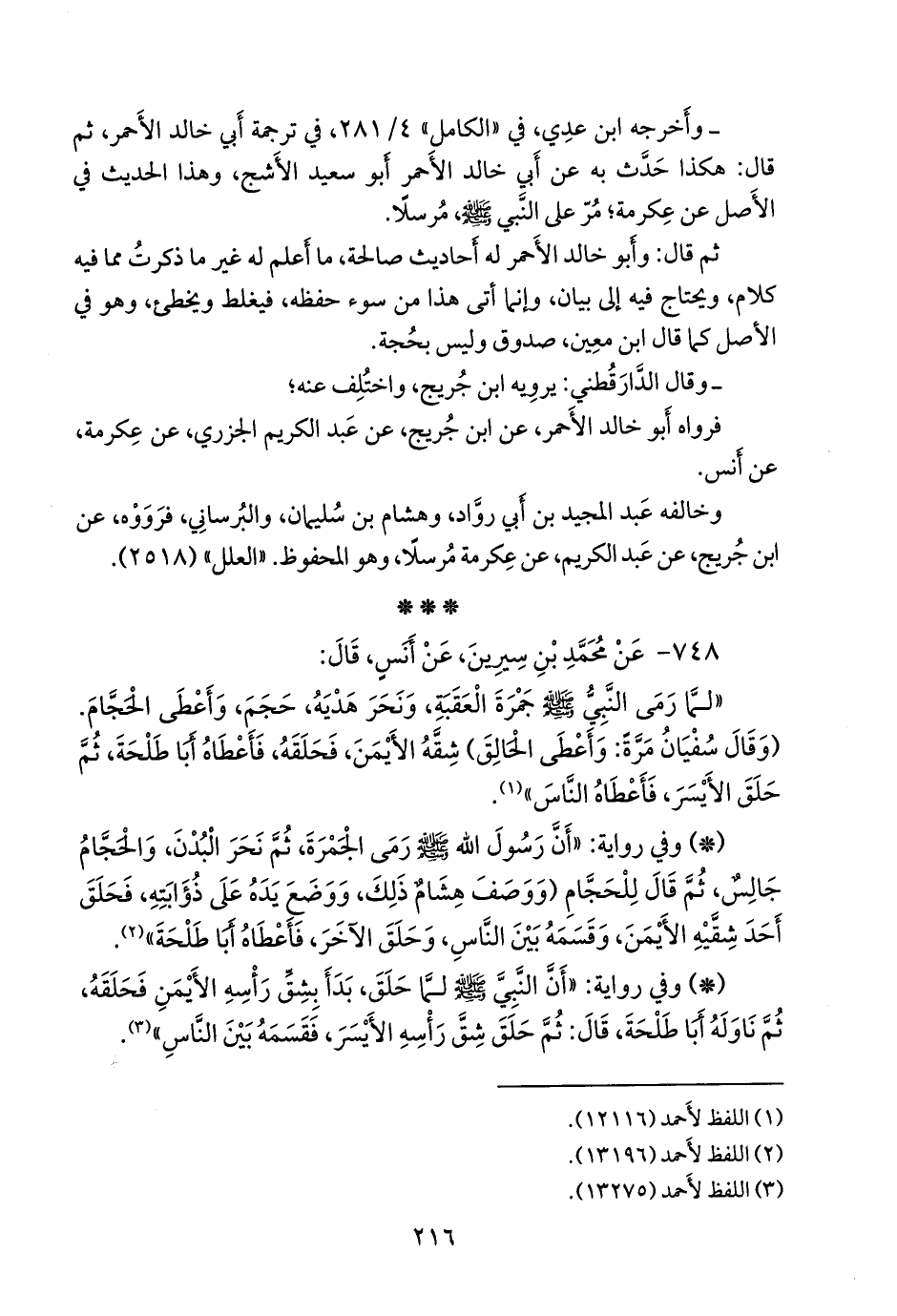 - وفي رواية: «أَن النبي صَلى الله عَليه وسَلم لما حلق، بدأَ بشق رأسه الأَيمن فحلقه، ثم ناوله أَبا طلحة، قال: ثم حلق شق رأسه الأَيسر، فقسمه بين الناس» (¬٣).
