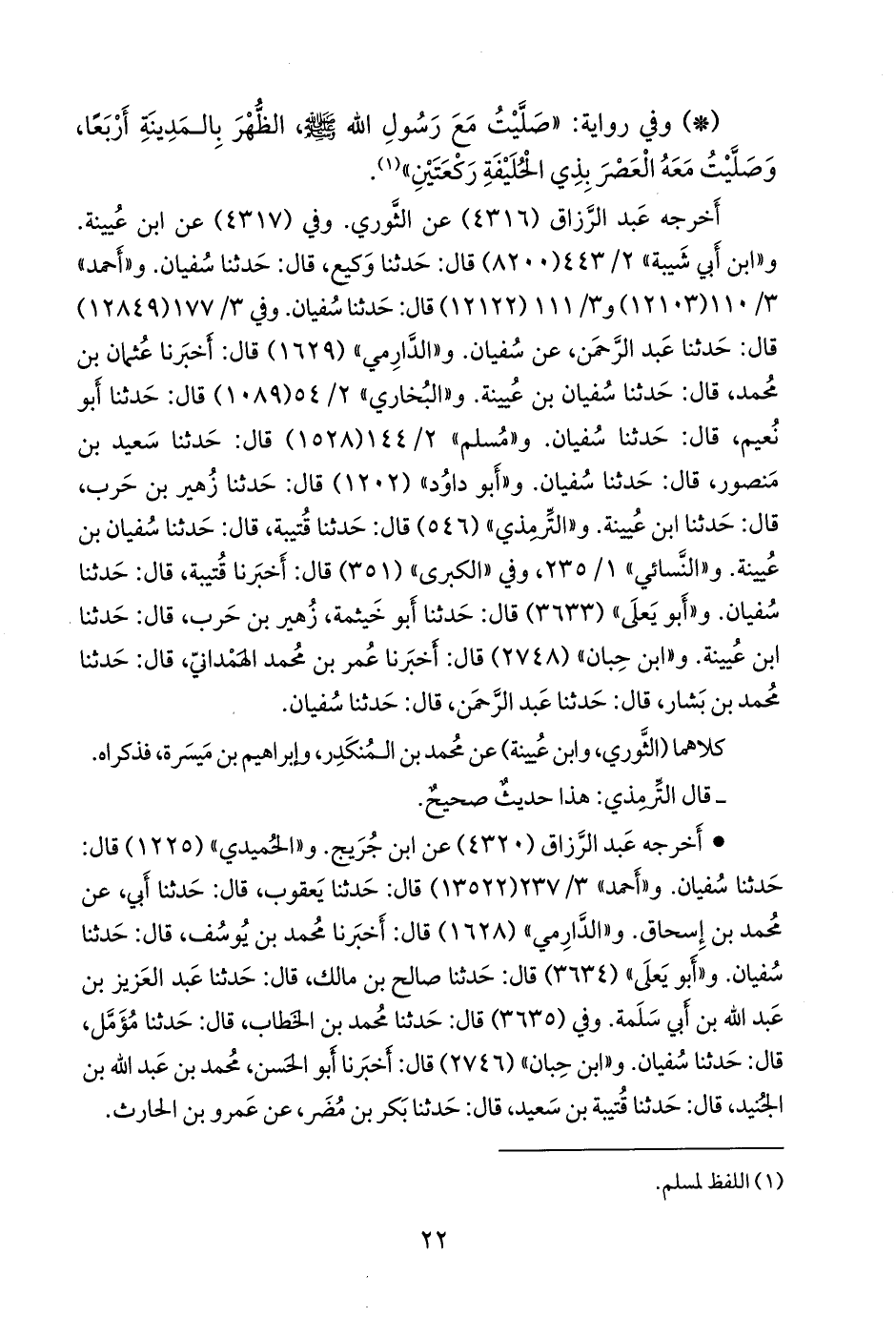 و «أَبو يَعلى» (٣٦٣٣) قال: حدثنا أَبو خيثمة زهير بن حرب، قال: حدثنا ابن عُيينة. و «ابن حِبَّان» (٢٧٤٨) قال: أخبرنا عمر بن محمد الهمداني، قال: حدثنا محمد بن بشار، قال: حدثنا عبد الرَّحمَن، قال: حدثنا سفيان.