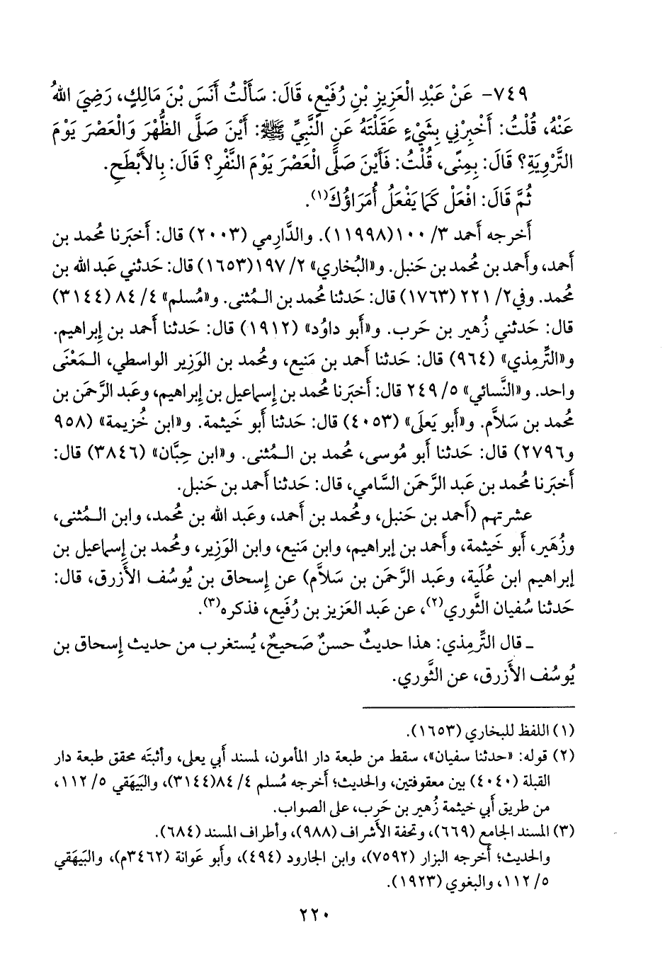 ٧٤٩ - عن عبد العزيز بن رفيع، قال: سألت أَنس بن مالك، رضي الله عنه، قلت: أخبرني بشيء عقلته عن النبي صَلى الله عَليه وسَلم: أين صلى الظهر والعصر يوم التروية؟ قال: بمنى، قلت: فأين صلى العصر يوم النفر؟ قال: بالأبطح.