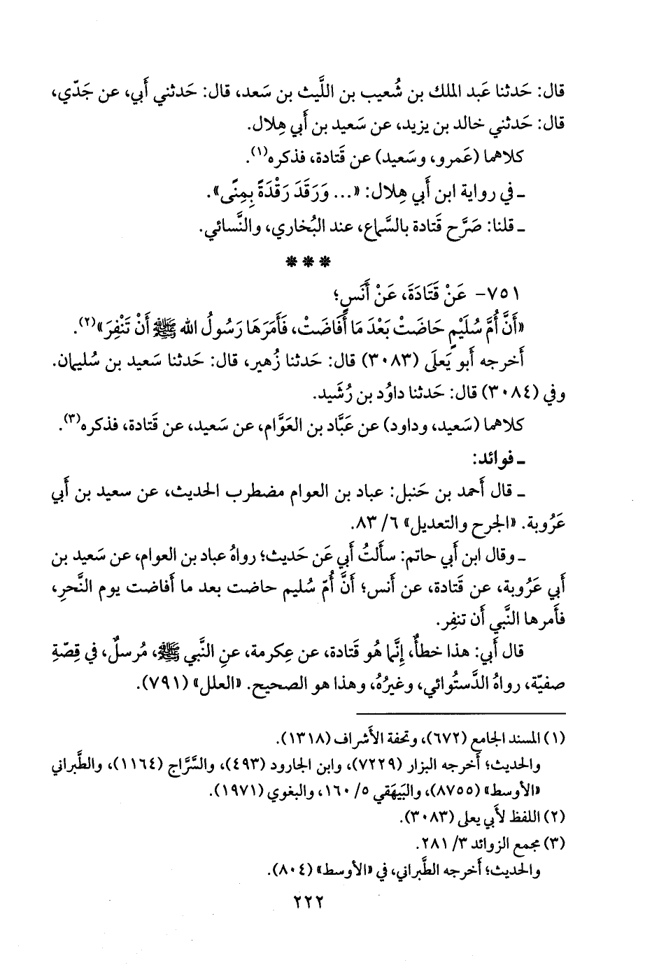 - وقال أَبو حاتم أيضا: هذا خطأ إنما هو كما رواه الدَّستوائي، عن قتادة، عن عكرمة، أن أُم سُليم حاضت.