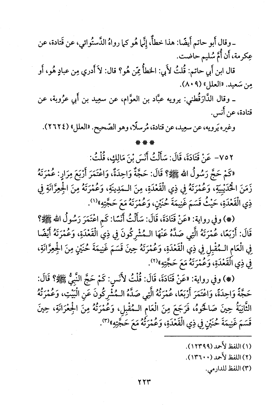 «كم حج رسول الله صَلى الله عَليه وسَلم؟ قال: حجة واحدة، واعتمر أربع مرار: عمرته زمن الحُدَيبيَة، وعمرته في ذي القعدة، من المدينة، وعمرته من الجِعْرَانة في ذي القعدة، حيث قسم غنيمة حنين، وعمرته مع حجته» (¬١).