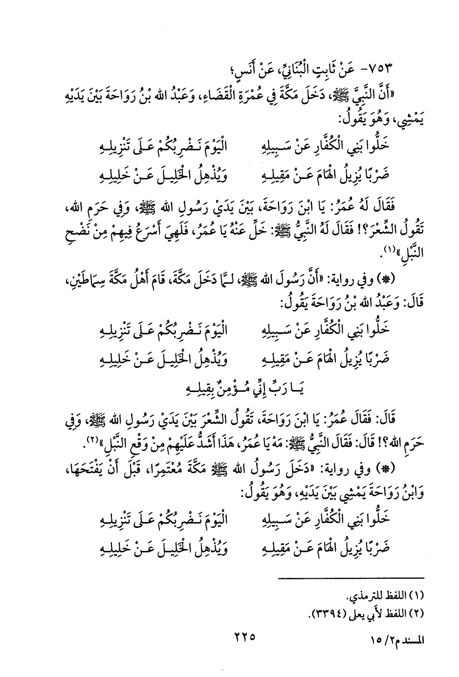 - وفي رواية: «أن رسول الله صَلى الله عَليه وسَلم لما دخل مكة، قام أهل مكة سماطين، قال: وعبد الله بن رَوَاحة يقول: