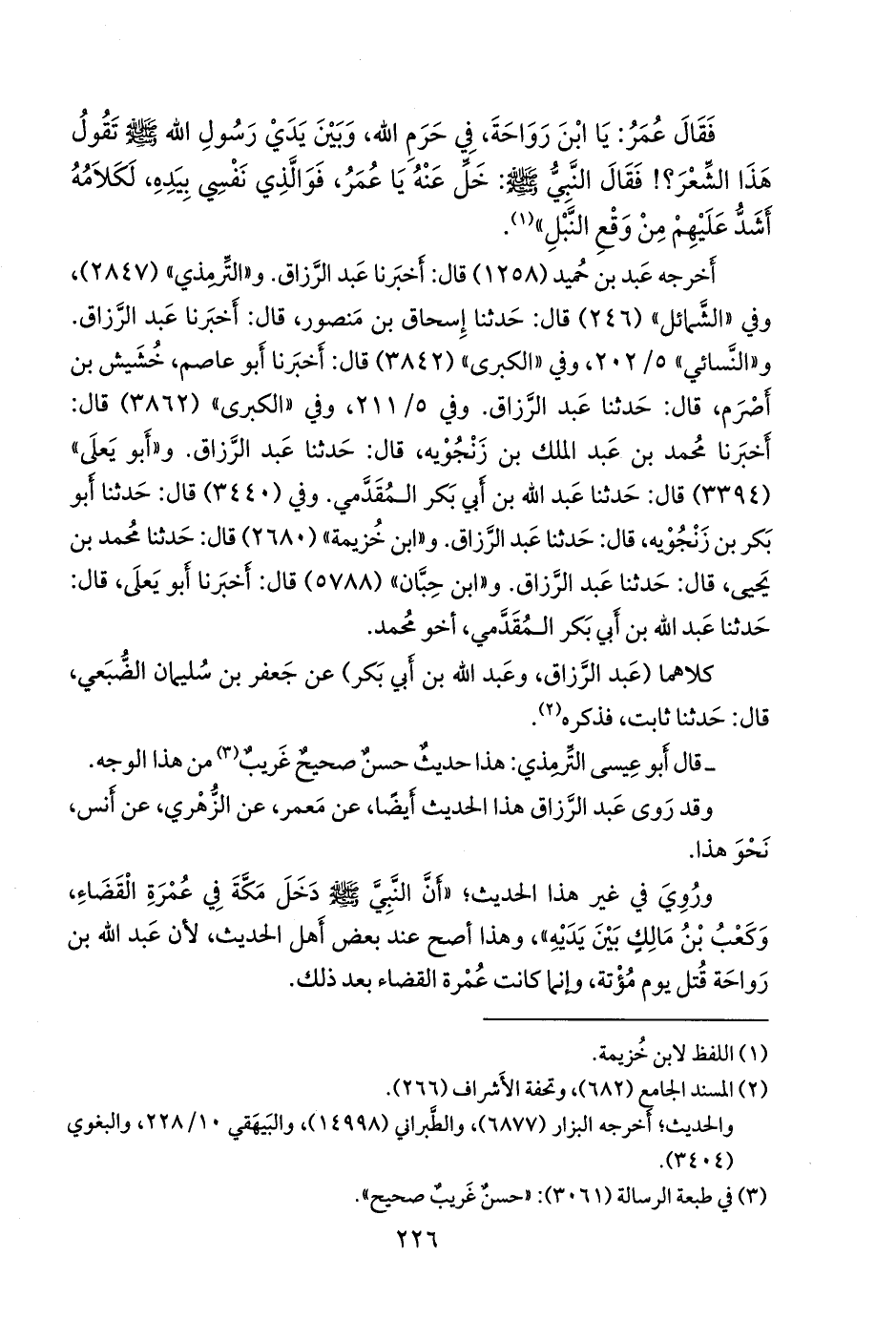 فقال عمر: يا ابن رَوَاحة، في حرم الله، وبين يدي رسول الله صَلى الله عَليه وسَلم تقول هذا الشعر؟! فقال النبي صَلى الله عَليه وسَلم: خل عنه يا عمر، فوالذي نفسي بيده، لكلامه أشد عليهم من وقع النبل» (¬١).