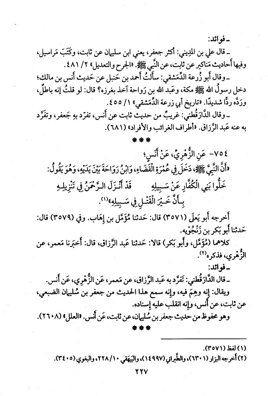 - وقال الدارقُطني: غريبٌ من حديث ثابت عن أَنس، تفرد به جعفر عنه، وتفرد به عنه عبد الرزاق. «أطراف الغرائب والأفراد» (٦٨١).
