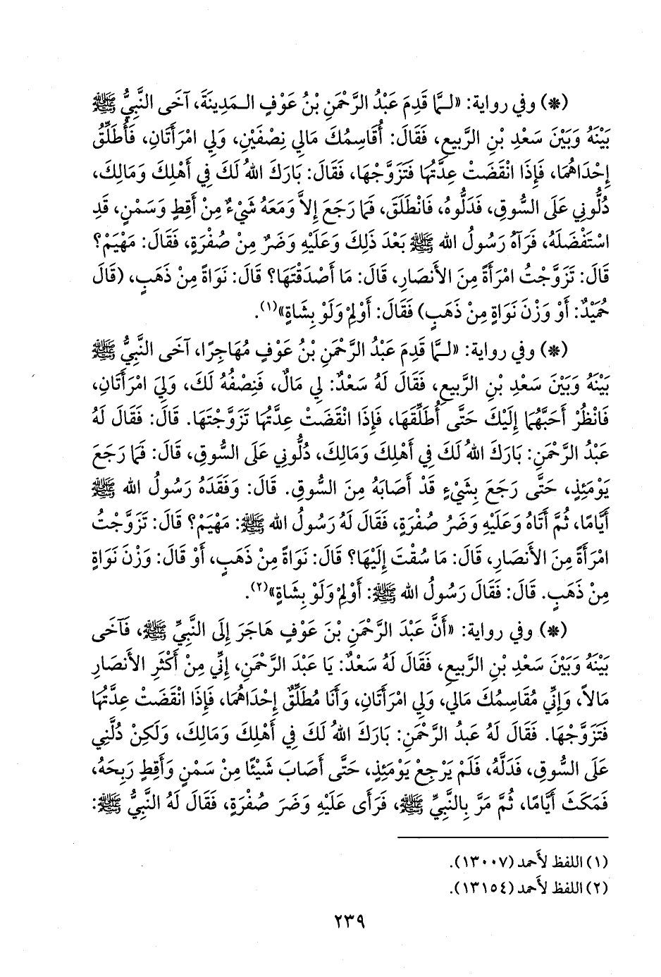 - وفي رواية: «لما قدم عبد الرَّحمَن بن عوف مهاجرا، آخى النبي صَلى الله عَليه وسَلم بينه وبين سعد بن الربيع، فقال له سعد: لي مال، فنصفه لك، ولي امرأتان، فانظر أحبهما إليك حتى أطلقها، فإذا انقضت عدتها تزوجتها. قال: فقال له عبد الرَّحمَن: بارك الله لك في أهلك ومالك، دلوني على السوق، قال: فما رجع يومئذ، حتى رجع بشيء قد أصابه من السوق. قال: وفقده رسول الله صَلى الله عَليه وسَلم أياما، ثم أتاه وعليه وضر صفرة، فقال له رسول الله صَلى الله عَليه وسَلم: مهيم؟ قال: تزوجت امرأة من الأنصار، قال: ما سقت إليها؟ قال: نواة من ذهب، أو قال: وزن نواة من ذهب. قال: فقال رسول الله صَلى الله عَليه وسَلم: أولم ولو بشاة» (¬١).