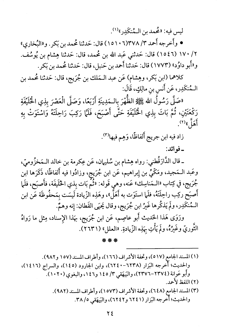 - قال الدارقُطني: رواه هشام بن سليمان، عن عكرمة بن خالد المخزومي، وعبد المجيد، ومكي بن إبراهيم، عن ابن جُريج، وزادوا فيه ألفاظا، ذكرها ابن جُريج، في كتاب «المناسك» عنه، وهي قوله: «ثم بات بذي الحليفة، فأصبح، فلما أصبح ركب راحلته، فلما استوت به أهل»، وهذه الزيادة ليست بمحفوظة عن ابن المُنكدِر، ولم يذكرها غير ابن جُريج، وقال يحيى القطان: إنه وهم.