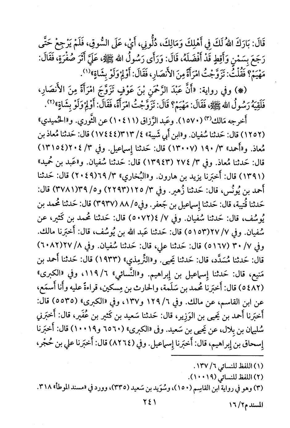 - وفي رواية: «أن عبد الرَّحمَن بن عوف تزوج امرأة من الأنصار، فلقيه رسول الله صَلى الله عَليه وسَلم فقال: مهيم؟ قال: تزوجت امرأة، فقال: أولم ولو بشاة» (¬١).