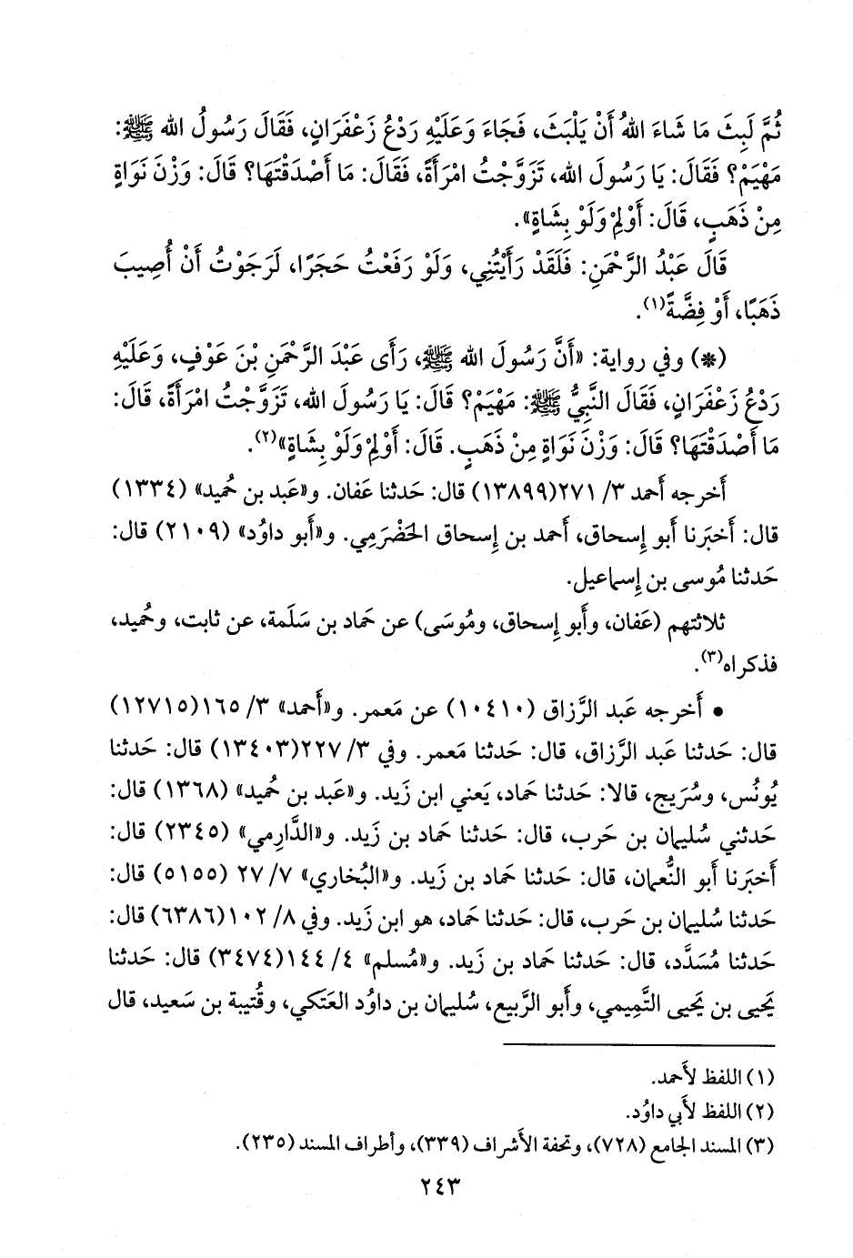 «أن النبي صَلى الله عَليه وسَلم لقي عبد الرَّحمَن بن عوف، وبه وضر من خلوق، فقال له رسول الله صَلى الله عَليه وسَلم: مهيم، يا عبد الرَّحمَن؟ قال: تزوجت امرأة من الأنصار، قال: كم أصدقتها؟ قال: وزن نواة من ذهب، فقال النبي صَلى الله عَليه وسَلم: أولم ولو بشاة».