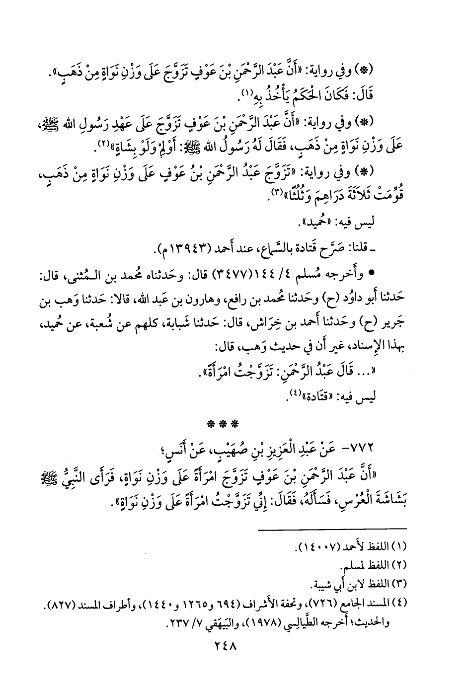 - وفي رواية: «أن عبد الرَّحمَن بن عوف تزوج على وزن نواة من ذهب».