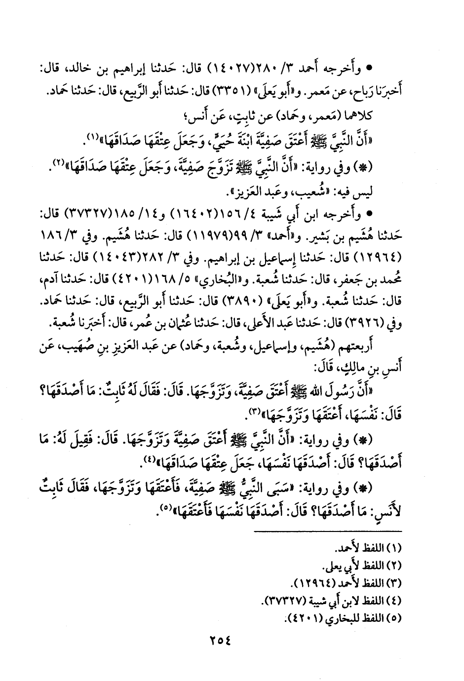 - وفي رواية: «سبى النبي صَلى الله عَليه وسَلم صفية، فأعتقها وتزوجها، فقال ثابت لأنس: ما أصدقها؟ قال: أصدقها نفسها فأعتقها» (¬٥).