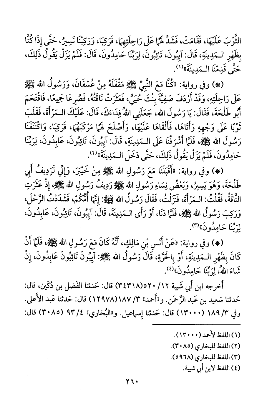 - وفي رواية: «أقبلنا مع رسول الله صَلى الله عَليه وسَلم من خيبر، وإني لرديف أبي طلحة، وهو يسير، وبعض نساء رسول الله صَلى الله عَليه وسَلم رديف رسول الله صَلى الله عَليه وسَلم إذ عثرت الناقة، فقلت: المرأة، فنزلت، فقال رسول الله صَلى الله عَليه وسَلم: إنها أمكم، فشددت الرحل، وركب رسول الله صَلى الله عَليه وسَلم فلما دنا، أو رأى المدينة، قال: آيبون، تائبون، عابدون، لربنا حامدون» (¬١).