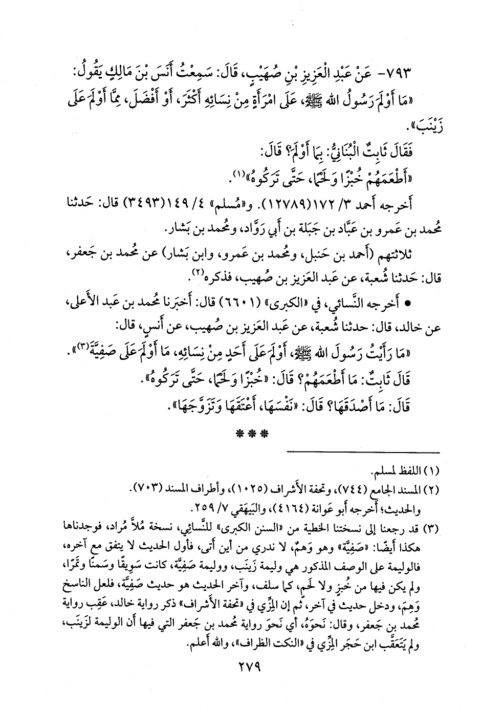 (¬٣) قد رجعنا إلى نسختنا الخطية من «السنن الكبرى» للنسائي، نسخة ملا مراد، فوجدناها هكذا أيضا: «صفية» وهو وهم، لا ندري من أين أتى، فأول الحديث لا يتفق مع آخره، فالوليمة على الوصف المذكور هي وليمة زينب، ووليمة صفية، كانت سويقا وسمنا وتمرا، ولم يكن فيها من خبز ولا لحم، كما سلف، وآخر الحديث هو حديث صفية، فلعل الناسخ وهم، ودخل حديث في آخر، ثم إن المِزِّي في «تحفة الأشراف» ذكر رواية خالد، عقب رواية محمد بن جعفر، وقال: نحوه، أي نحو رواية محمد بن جعفر التي فيها أن الوليمة لزينب، ولم يتعقب ابن حجر المِزِّي في «النكت الظراف»، والله أعلم.