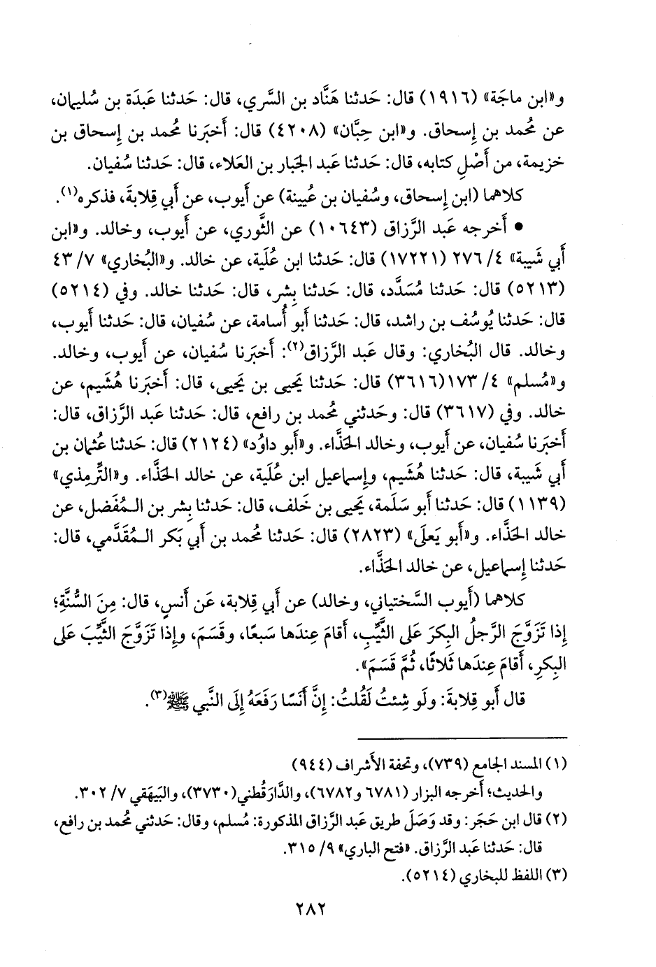كلاهما (أيوب السَّخْتِياني، وخالد) عن أبي قلابة، عن أَنس، قال: من السنة؛ إذا تزوج الرجل البكر على الثيب، أقام عندها سبعا، وقسم، وإذا تزوج الثيب على البكر، أقام عندها ثلاثا، ثم قسم».