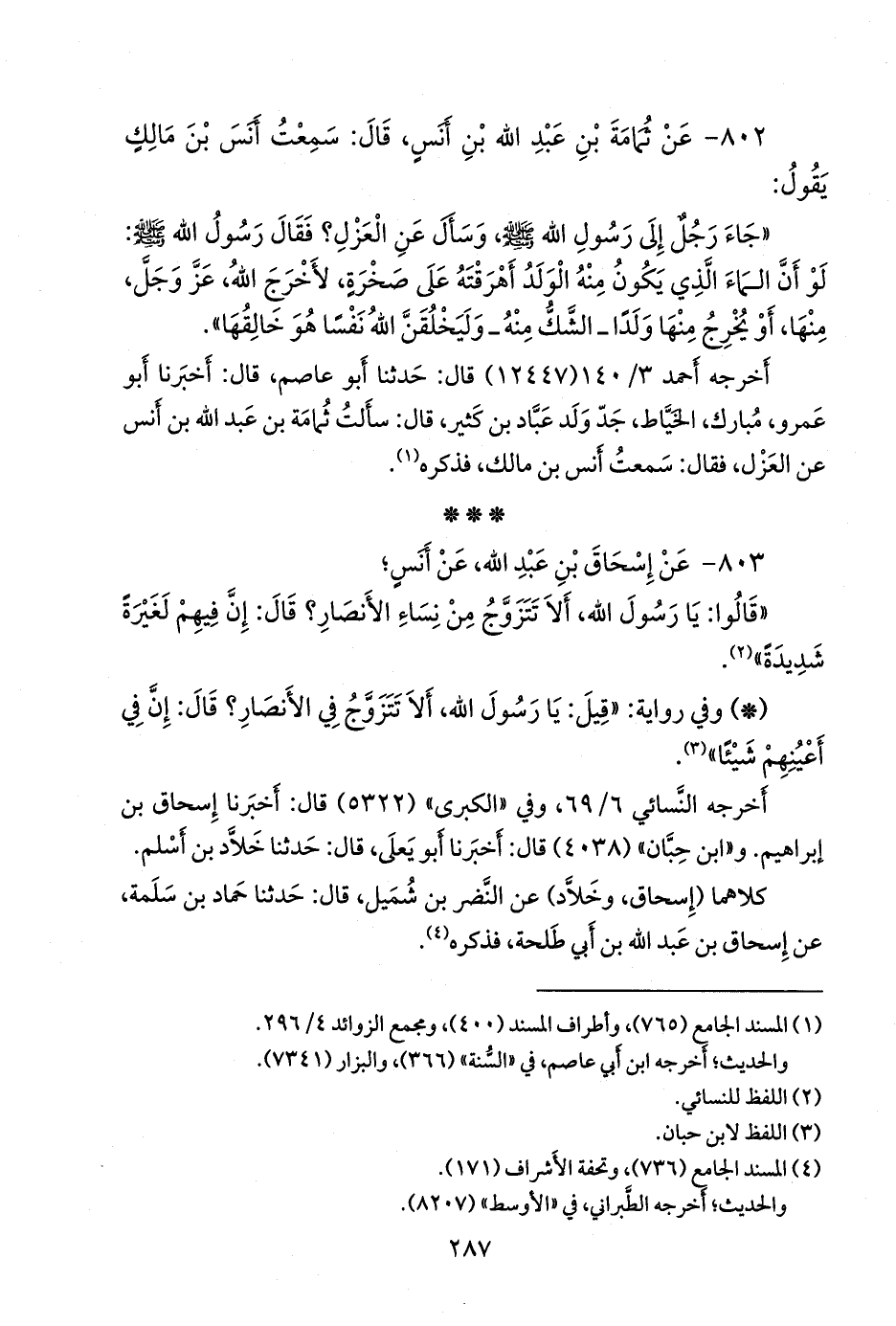 أخرجه أحمد (١٢٤٤٧) قال: حدثنا أَبو عاصم، قال: أخبرنا أَبو عَمرو، مبارك، الخياط، جد ولد عباد بن كثير، قال: سألت ثمامة بن عبد الله بن أَنس عن العزل، فقال: سمعت أَنس بن مالك، فذكره (¬١).