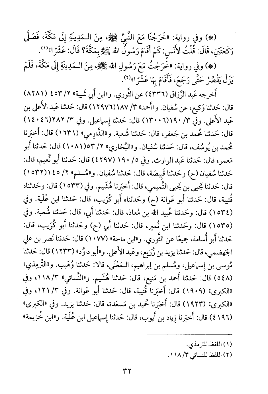 - وفي رواية: «خرجت مع رسول الله صَلى الله عَليه وسَلم من المدينة إلى مكة، فلم يزل يقصر حتى رجع، فأقام بها عشرا» (¬١).