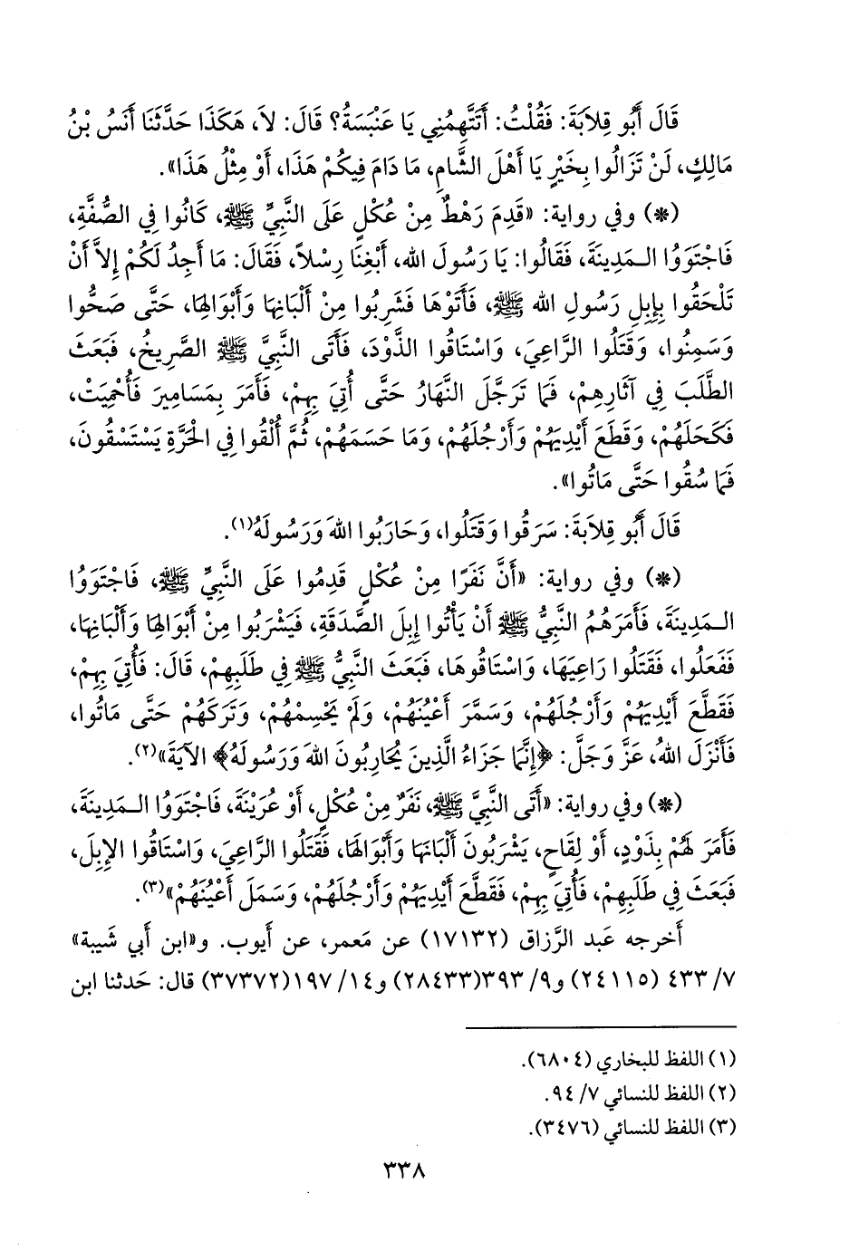- وفي رواية: «أن نفرا من عكل قدموا على النبي صَلى الله عَليه وسَلم فاجتووا المدينة، فأمرهم النبي صَلى الله عَليه وسَلم أن يأتوا إبل الصدقة، فيشربوا من أَبوالها وألبانها، ففعلوا، فقتلوا راعيها، واستاقوها، فبعث النبي صَلى الله عَليه وسَلم في طلبهم، قال: فأتي بهم، فقطع أيديهم وأرجلهم، وسمر أعينهم، ولم يحسمهم، وتركهم حتى ماتوا، فأنزل الله، عز وجل: {إنما جزاء الذين يحاربون الله ورسوله} الآية» (¬٢).