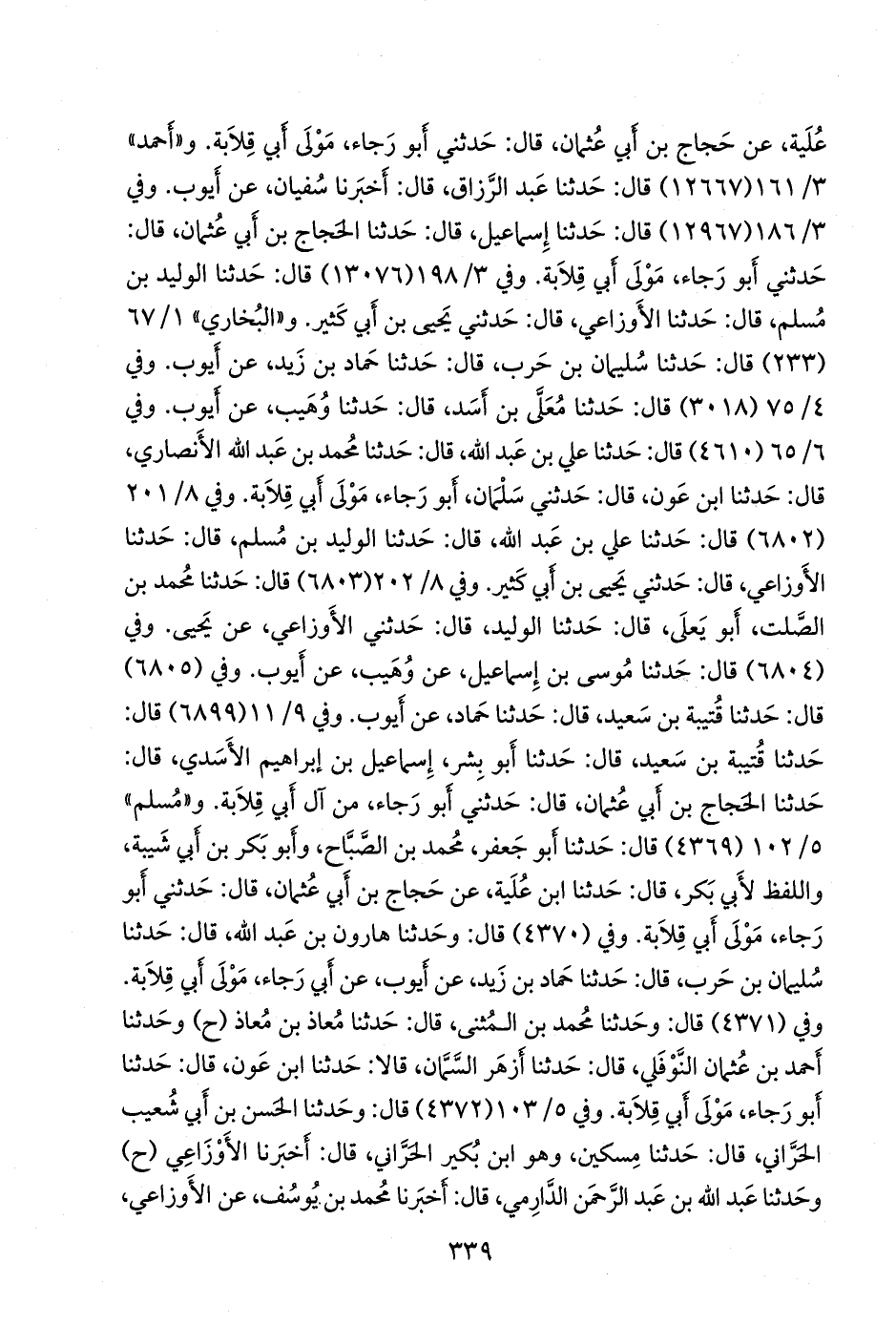 و «أحمد» ٣/ ١٦١ (١٢٦٦٧) قال: حدثنا عبد الرزاق، قال: أخبرنا سفيان، عن أيوب. وفي ٣/ ١٨٦ (١٢٩٦٧) قال: حدثنا إسماعيل، قال: حدثنا الحجاج بن أبي عثمان، قال: حدثني أَبو رجاء مولى أبي قلابة. وفي ٣/ ١٩٨ (١٣٠٧٦) قال: حدثنا الوليد بن مسلم، قال: حدثنا الأوزاعي، قال: حدثني يحيى بن أبي كثير. و «البخاري» ١/ ٥٦ (٢٣٣) قال: حدثنا سليمان بن حرب، قال: حدثنا حماد بن زيد، عن أيوب. وفي ٤/ ٦٢ (٣٠١٨) قال: حدثنا مُعَلى بن أسد، قال: حدثنا وهيب، عن أيوب. وفي ٦/ ٥٢ (٤٦١٠) قال: حدثنا علي بن عبد الله، قال: حدثنا محمد بن عبد الله الأَنصاري، قال: حدثنا ابن عون، قال: حدثني سلمان، أَبو رجاء مولى أبي قلابة. وفي ٨/ ١٦٢ (٦٨٠٢) قال: حدثنا علي بن عبد الله، قال: حدثنا الوليد بن مسلم، قال: حدثنا الأوزاعي، قال: حدثني يحيى بن أبي كثير. وفي ٨/ ١٦٣ (٦٨٠٣) قال: حدثنا محمد بن الصلت، أَبو يَعلى، قال: حدثنا الوليد، قال: حدثني الأوزاعي، عن يحيى. وفي (٦٨٠٤) قال: حدثنا موسى بن إسماعيل، عن وهيب، عن أيوب. وفي (٦٨٠٥) قال: حدثنا قتيبة بن سعيد، قال: حدثنا حماد، عن أيوب. وفي ٩/ ٩ (٦٨٩٩) قال: حدثنا قتيبة بن سعيد، قال: حدثنا أَبو بشر، إسماعيل بن إبراهيم الأسدي، قال: حدثنا الحجاج بن أبي عثمان، قال: حدثني أَبو رجاء، من آل أبي قلابة. و «مسلم» ٥/ ١٠٢ (٤٣٦٩) قال: حدثنا أَبو جعفر، محمد بن الصباح، وأَبو بكر بن أبي شيبة، واللفظ لأَبي بكر، قال: حدثنا ابن عُلَية، عن حجاج بن أبي عثمان، قال: حدثني أَبو رجاء مولى أبي قلابة. وفي (٤٣٧٠) قال: وحدثنا هارون بن عبد الله، قال: حدثنا سليمان بن حرب، قال: حدثنا حماد بن زيد، عن أيوب، عن أبي رجاء مولى أبي قلابة. وفي (٤٣٧١) قال: وحدثنا محمد بن المثنى، قال: حدثنا معاذ بن معاذ (ح) وحدثنا أحمد بن عثمان النوفلي، قال: حدثنا أزهر السمان، قالا: حدثنا ابن عون، قال: حدثنا أَبو رجاء مولى أبي قلابة. وفي ٥/ ١٠٣ (٤٣٧٢) قال: وحدثنا الحسن بن أبي شعيب الحراني، قال: حدثنا مسكين، وهو ابن بكير الحراني، قال: أخبرنا الأوزاعي (ح) وحدثنا عبد الله بن عبد الرَّحمَن الدَّارِمي، قال: أخبرنا محمد بن يوسف، عن الأوزاعي،