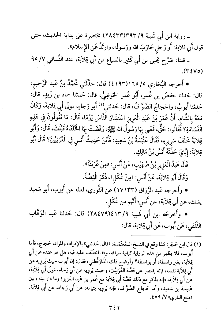 (¬١) قال ابن حجر: كذا وقع في النسخ المعتمدة: «قال: حدثني» بالإفراد، والمراد، حجاج، فأما أيوب، فلا يظهر من هذه الرواية كيفية سياقه، وقد اختلف عليه فيه، هل هو عنده عن أبي قلابة، بغير واسطة، أو بواسطة؟ وأوضح ذلك الدارقُطني، فقال: إن أيوب حيث يرويه عن أبي قلابة نفسه، فإنه يقتصر على قصة العرنيين، وحيث يرويه عن أبي رجاء, مولى أبي قلابة، عن أبي قلابة، فإنه يذكر مع ذلك قصة أبي قلابة مع عمر بن عبد العزيز؛ وما دار بينه وبين عنبسة بن سعيد، وأما حجاج الصواف، فإنه يرويه بتمامه، عن أبي رجاء، عن أبي قلابة. «فتح الباري» ٧/ ٤٥٩.
