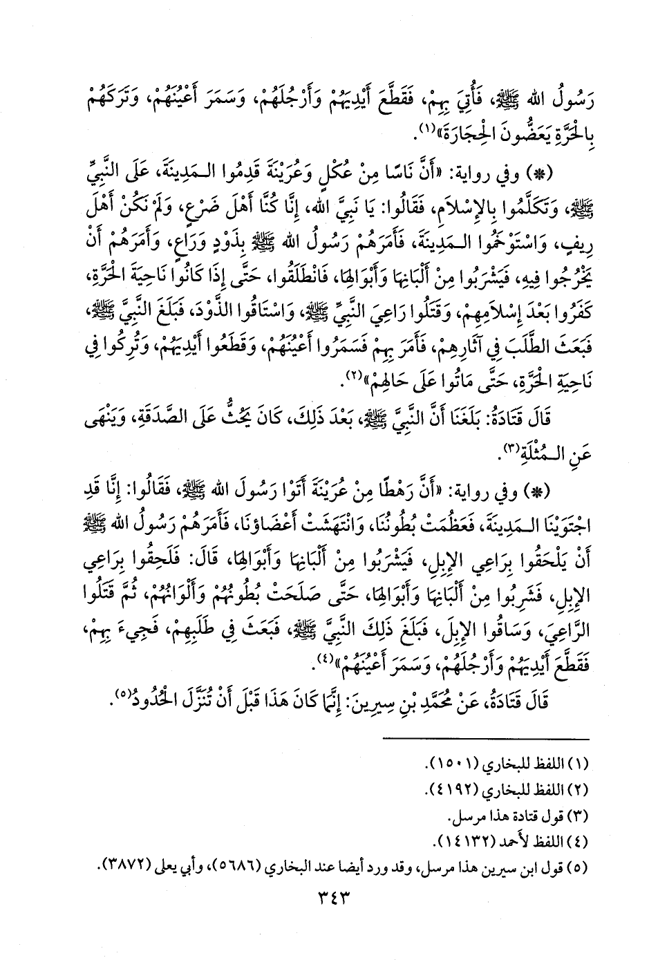 - وفي رواية: «أن رهطا من عرينة أتوا رسول الله صَلى الله عَليه وسَلم فقالوا: إنا قد اجتوينا المدينة، فعظمت بطوننا، وانتهشت أعضاؤنا، فأمرهم رسول الله صَلى الله عَليه وسَلم أن يلحقوا براعي الإبل، فيشربوا من ألبانها وأَبوالها، قال: فلحقوا براعي الإبل، فشربوا من ألبانها وأَبوالها، حتى صلحت بطونهم وألوانهم، ثم قتلوا الراعي، وساقوا الإبل، فبلغ ذلك النبي صَلى الله عَليه وسَلم فبعث في طلبهم، فجيء بهم، فقطع أيديهم وأرجلهم، وسمر أعينهم» (¬١).