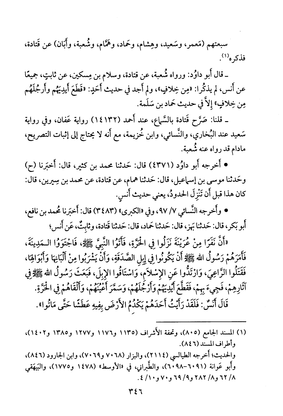 - وقال أَبو داود: ورواه شعبة، عن قتادة، وسَلَّام بن مِسكين، عن ثابت، جميعًا عن أَنس، لم يذكُرا: «من خِلافٍ»، ولم أَجد في حديث أَحَد: «قَطَّع أَيديَهم وأَرجلهم من خِلافٍ»، إِلا في حديث حماد بن سلمة.